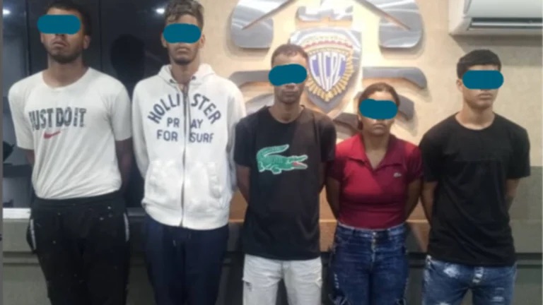 Los detenidos han sido identificados como Rico Josué David Gómez Andrade (18), Erick Alexander Gómez Álvarez (24), con antecedentes por posesión de estupefacientes, Yeiker Johel Ruiz Ruiz (20), Haylee Nicold Madriz Vielma (21) y Jeickferson Yair Blanco Castro (19), quienes tienen registros por robo genérico. Todos se encuentran bajo custodia de la policía científica.