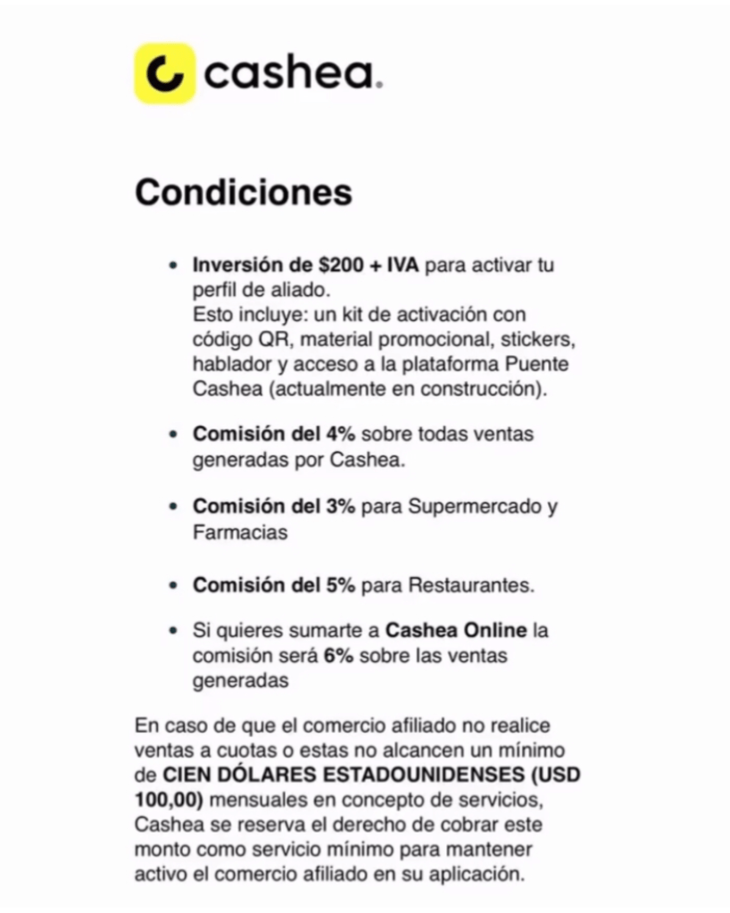 Sin embargo, la empresa también ha establecido una política de mantenimiento. En caso de que un comercio afiliado no realice ventas a cuotas o estas no alcancen un mínimo de CIEN DÓLARES ESTADOUNIDENSES (USD 100,00) mensuales en concepto de servicios, Cashea se reserva el derecho de cobrar este monto como servicio mínimo para mantener activo al comercio en su aplicación.