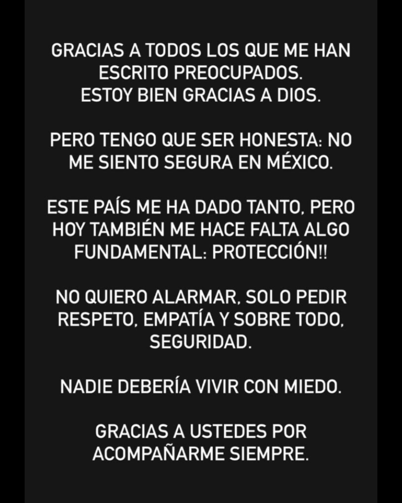 Sin embargo, la angustia de sus seguidores se disipó horas después cuando la propia Aleska Génesis reapareció a través de sus historias de Instagram para asegurar que se encontraba bien. En sus publicaciones, la modelo venezolana denunció sentirse desprotegida en México y afirmó que su vida corre peligro, haciendo un llamado urgente a la justicia mexicana para que tome cartas en el asunto.