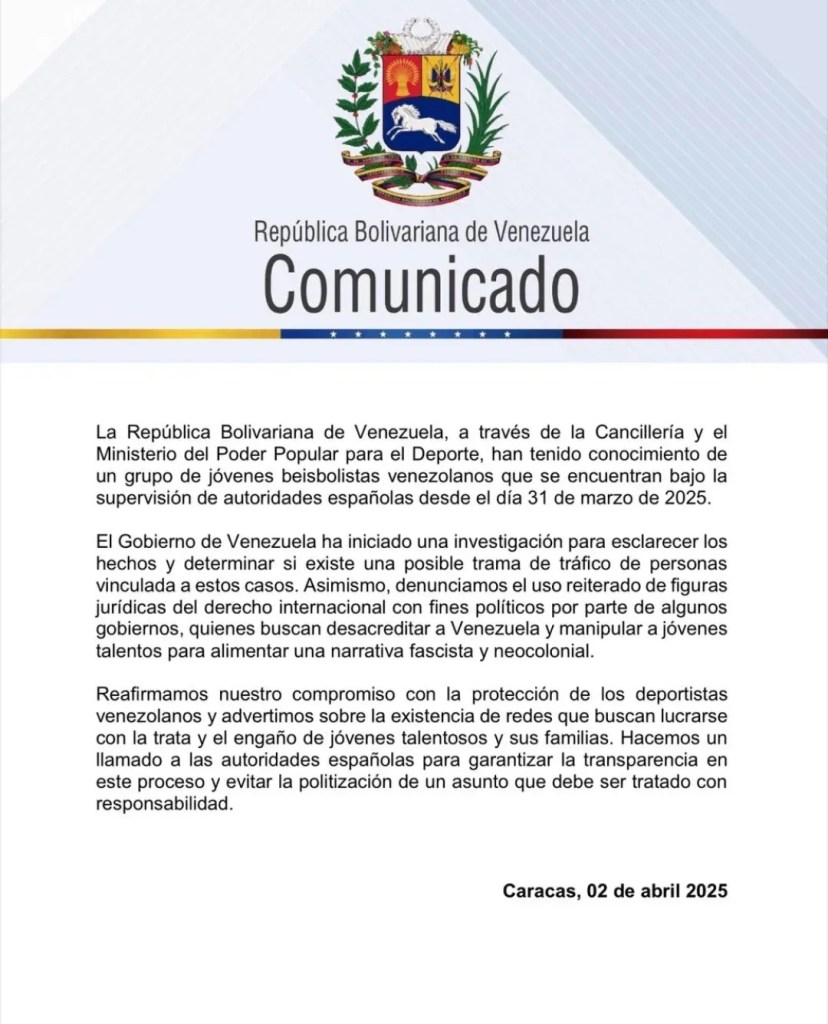 La República Bolivariana de Venezuela, a través de su Cancillería y el Ministerio del Poder Popular para el Deporte, ha iniciado una investigación sobre un grupo de jóvenes beisbolistas venezolanos que se encuentran bajo la supervisión de autoridades españolas desde el 31 de marzo de 2025.