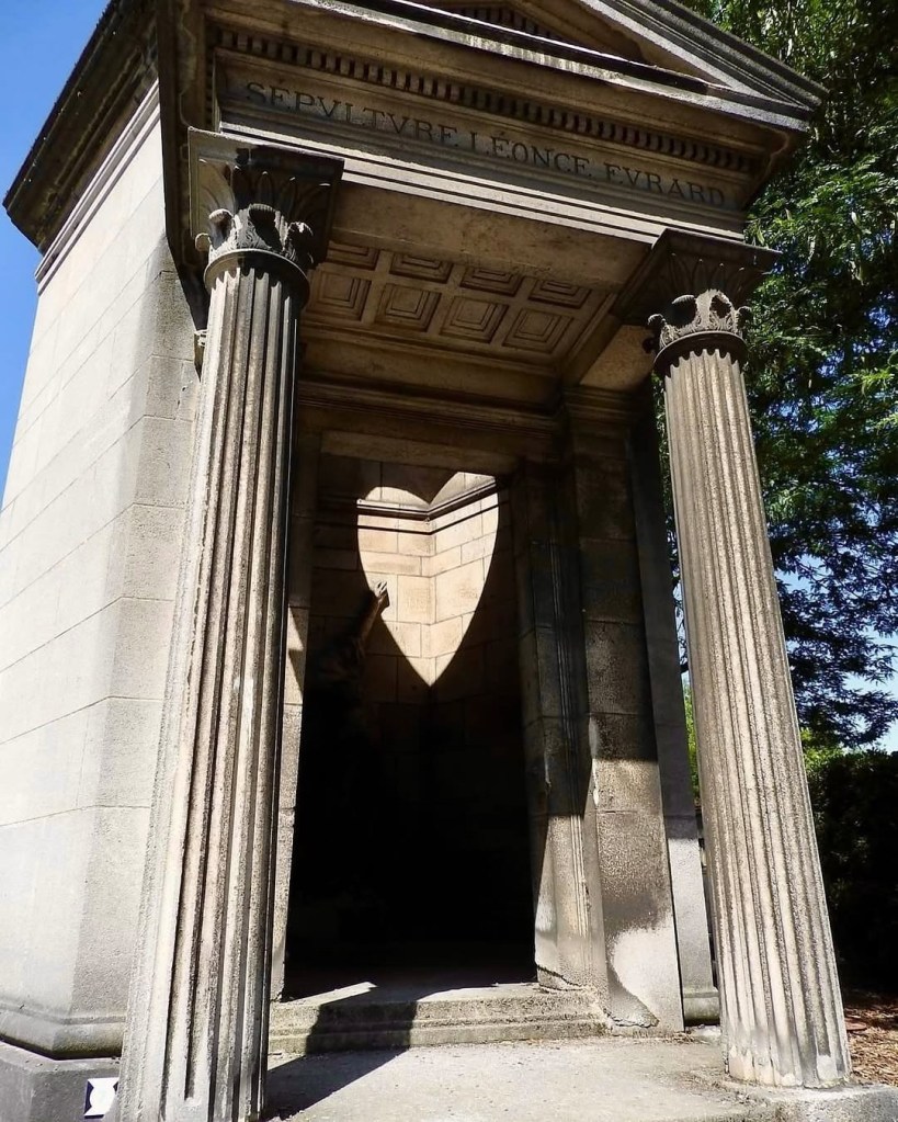 La escultura principal del mausoleo representa al propio Léonce Evrard en un gesto de duelo, con su brazo extendido hacia ese espacio que, durante un breve instante anual, se llena de una magia celestial.