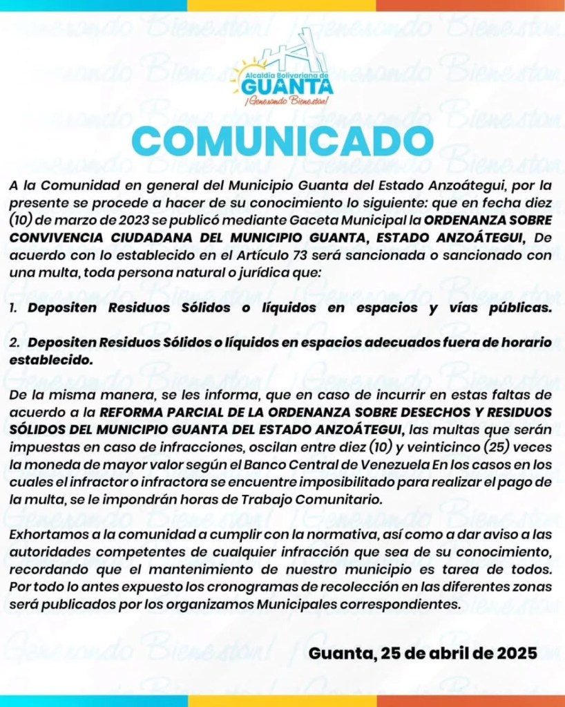 La policía del municipio Guanta en Anzoátegui, informó a través de su cuenta de Instagram, que para dar cumplimiento a la ordenanza de Convivencia Ciudadana, publicada en Gaceta municipal, se aplicarán multas a personas naturales y jurídicas que depositen desechos y residuos en espacios públicos y/o fuera del horario establecido.