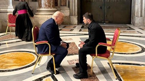 La reunión de 15 minutos tuvo lugar en la Basílica de San Pedro. Las fotografías publicadas por la oficina de Zelenski muestran a los dos hombres sentados uno frente al otro en medio de un salón, sin ninguno de sus ayudantes cerca.