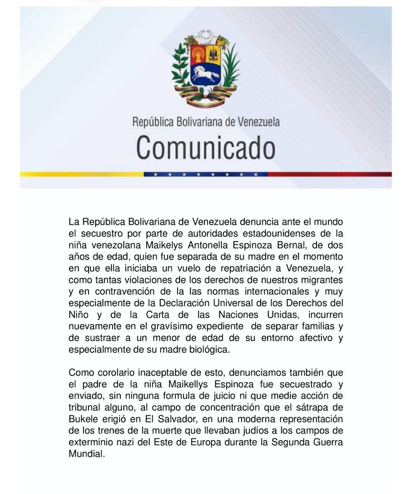 El gobierno denunció el presunto secuestro por parte de autoridades estadounidenses de la niña venezolana, Maikelys Antonella Espinoza Bernal, de dos años de edad, quien fue separada de su madre en el momento en que ella iniciaba un vuelo de repatriación a Venezuela.