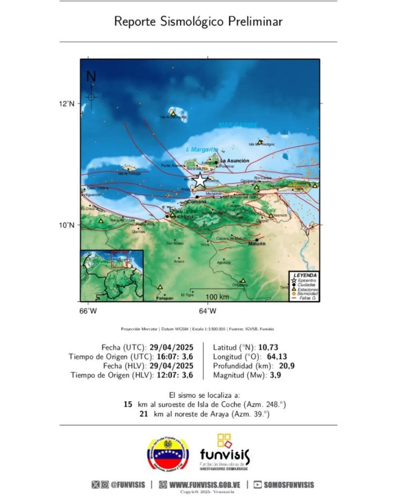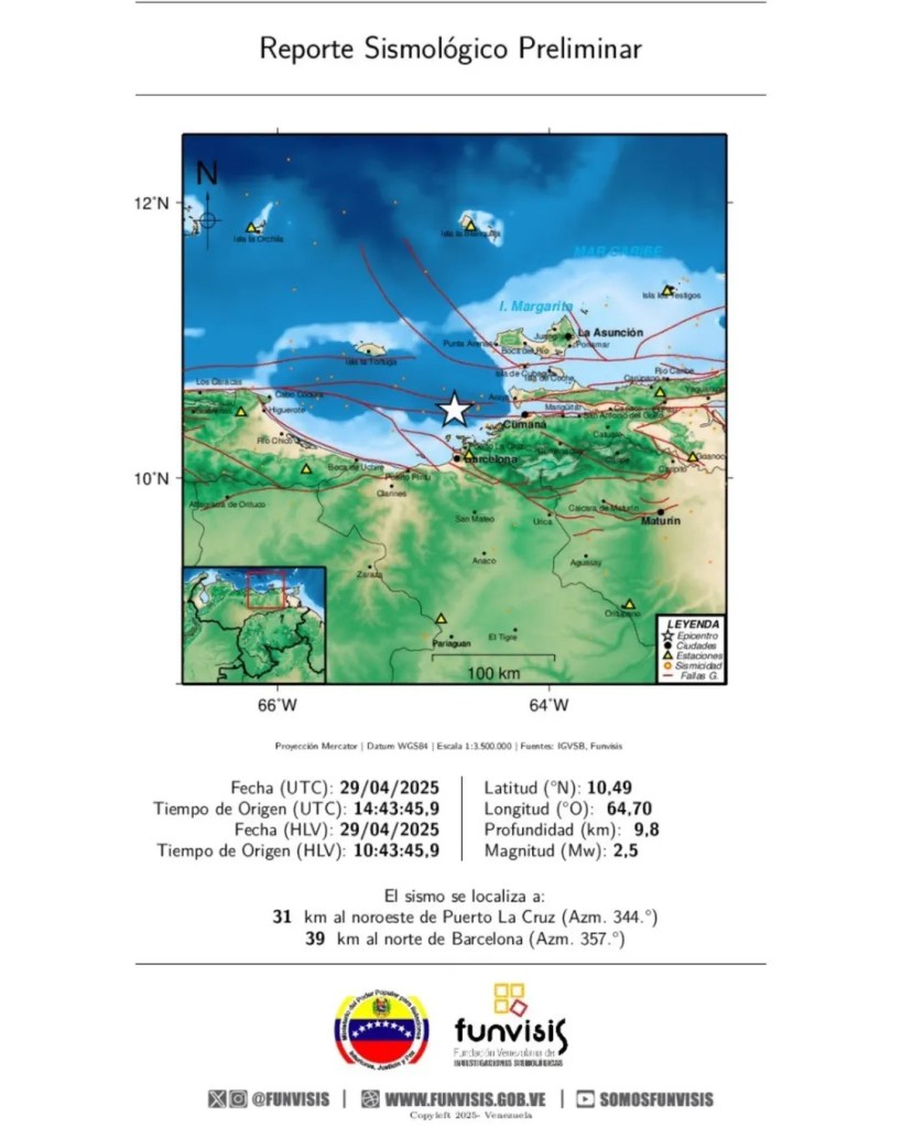 A través de sus redes sociales, la fundación venezolana de Investigaciones Sismológicas reportó al menos tres sismos sentidos en la región oriental este martes 29 de abril: