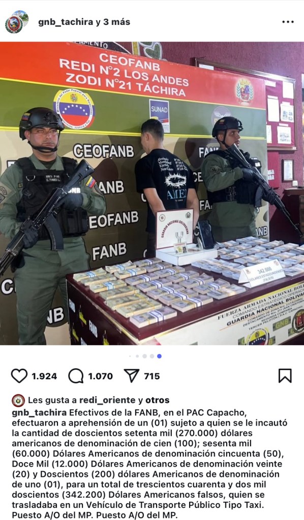De acuerdo a lo reseñado por la GNB Táchira, en su cuenta oficial de Instagram, al detenido, cuya identificación no fue revelada, le fue incautado la cantidad de 270 mil dólares en billetes de denominación de 100; $60.000 en denominación 50, $12.000 en billetes de 20 y $200 en denominación de uno, lo que arrojó un total de $342.200.