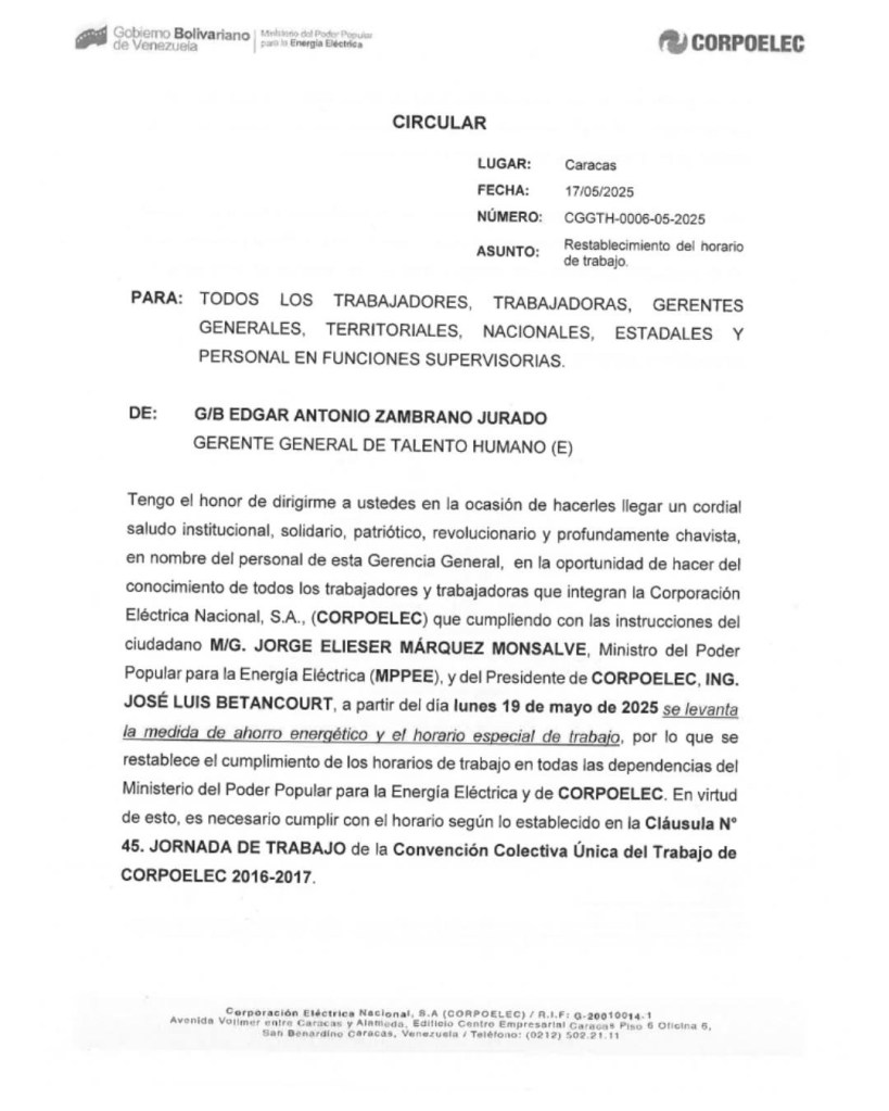 A partir de este lunes 19 de mayo de 2025, se restablecerá el cumplimiento de los horarios de trabajo en todas las dependencias del Ministerio del Poder Popular para la Energía Eléctrica y de Corpoelec. La circular especifica que es necesario cumplir con el horario estipulado en la cláusula N° 45, «Jornada de Trabajo», de la Convención Colectiva Única del Trabajo de Corpoelec 2016-2017.
