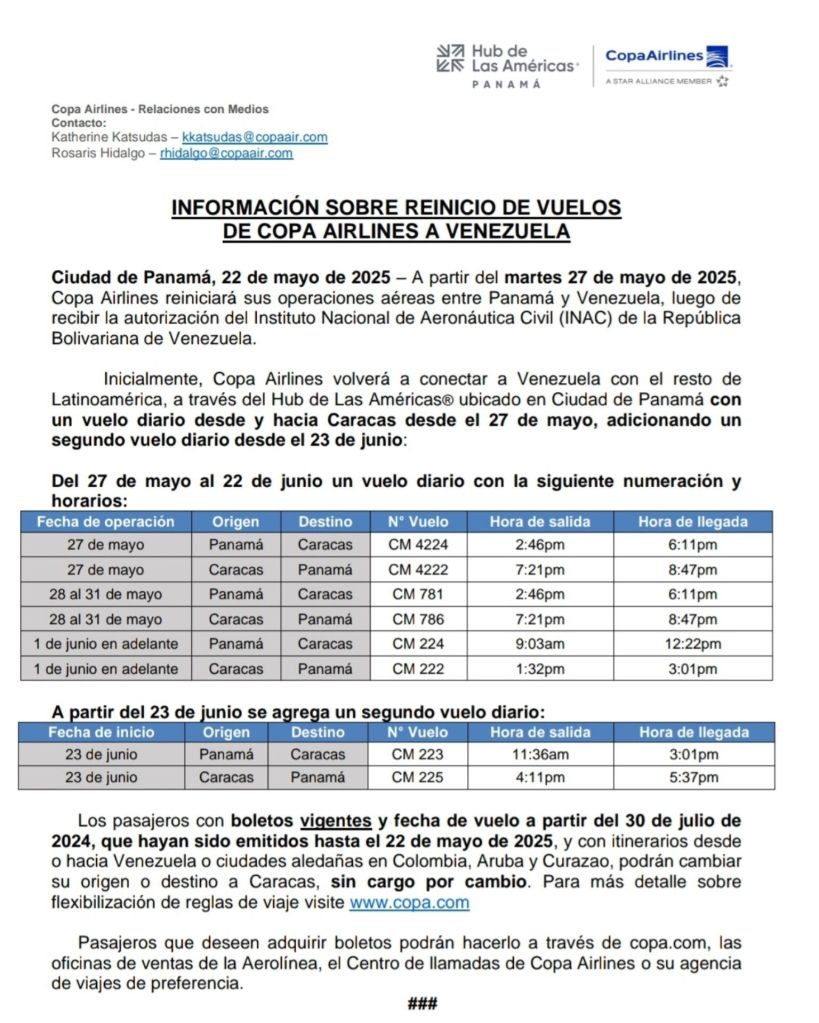 También informó la Aerolínea que los pasajeros con boletos vigentes, con fecha de vuelo a partir del 30 de julio de 2024, que hayan sido emitidos hasta el 22 de mayo de 2025, y con itinerarios desde o hacia Venezuela o ciudades aledañas en Colombia, Aruba y Curazao, podrán cambiar su origen o destino a Caracas, sin cargo por cambio. Indicaron que para más detalle sobre flexibilización de reglas de viaje pueden visitar su página web www.copa.com o en las oficinas de ventas de la Aerolínea, el Centro de llamadas de Copa Airlines o su agencia de viajes de preferencia.