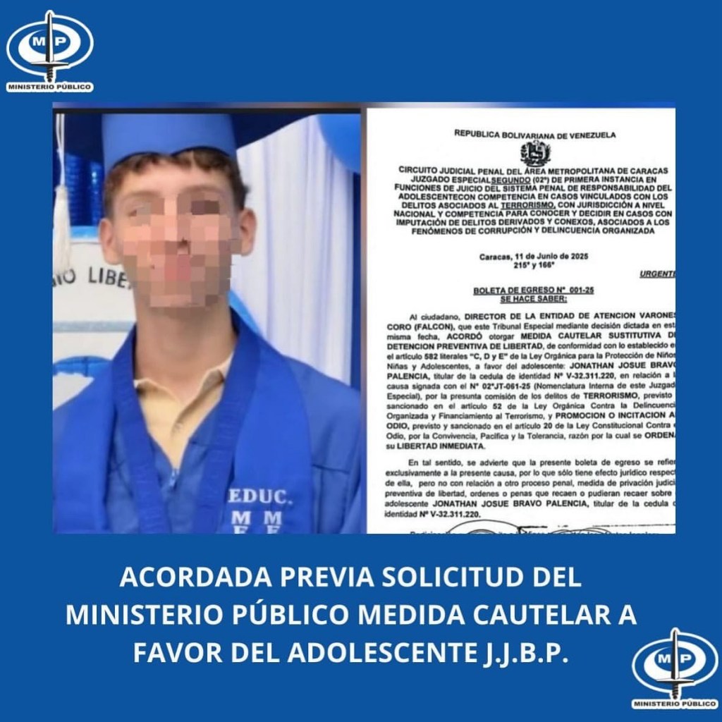 El Ministerio Público acordó este miércoles 11 de junio, una medida cautelar a favor de un menor de 17 años de edad, diagnosticado con Transtorno por Déficit de Atención con Hiperactividad (TDHA), quien se encontraba detenido desde el pasado 11 de enero del presente año en el estado Falcón, por los presuntos delitos de terrorismo e incitación al odio.