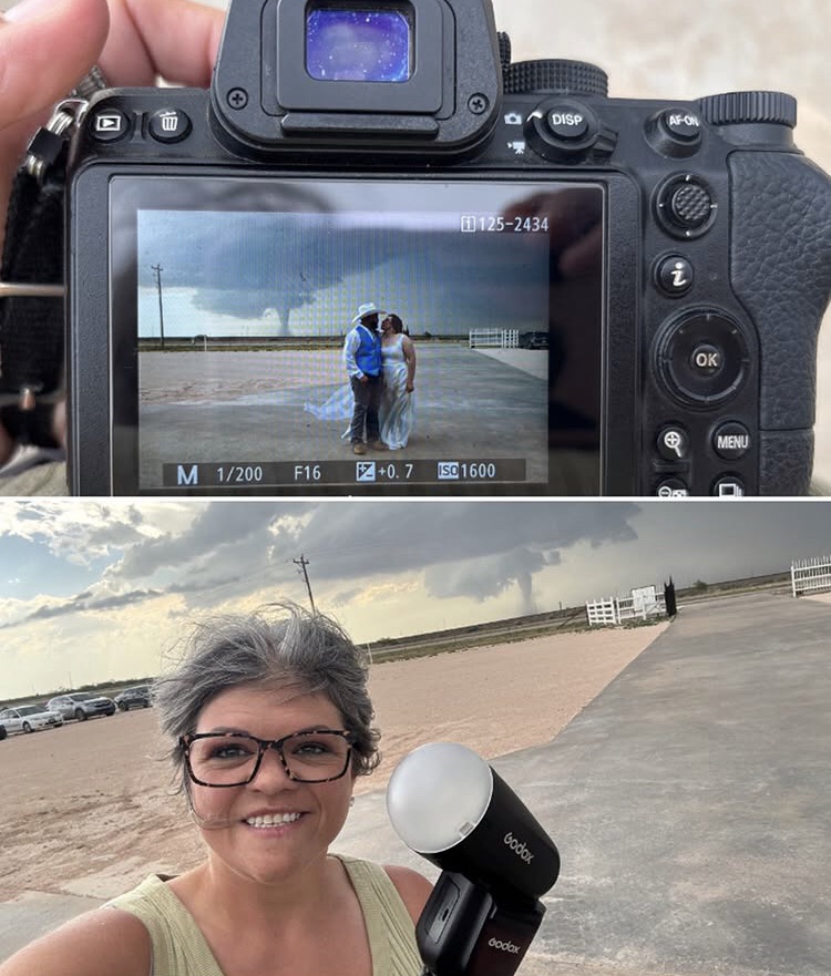 De manera sorpresiva, un tornado comenzó a formarse muy cerca de la locación de la boda. Este increíble momento fue capturado por la talentosa fotógrafa Chesnea Clemmons, quien inmortalizó una imagen que rápidamente se volvió viral. La escena, donde el amor de la pareja contrasta con la fuerza imponente de la naturaleza, ha sido catalogada por muchos como una de las fotografías de boda más épicas jamás tomadas.