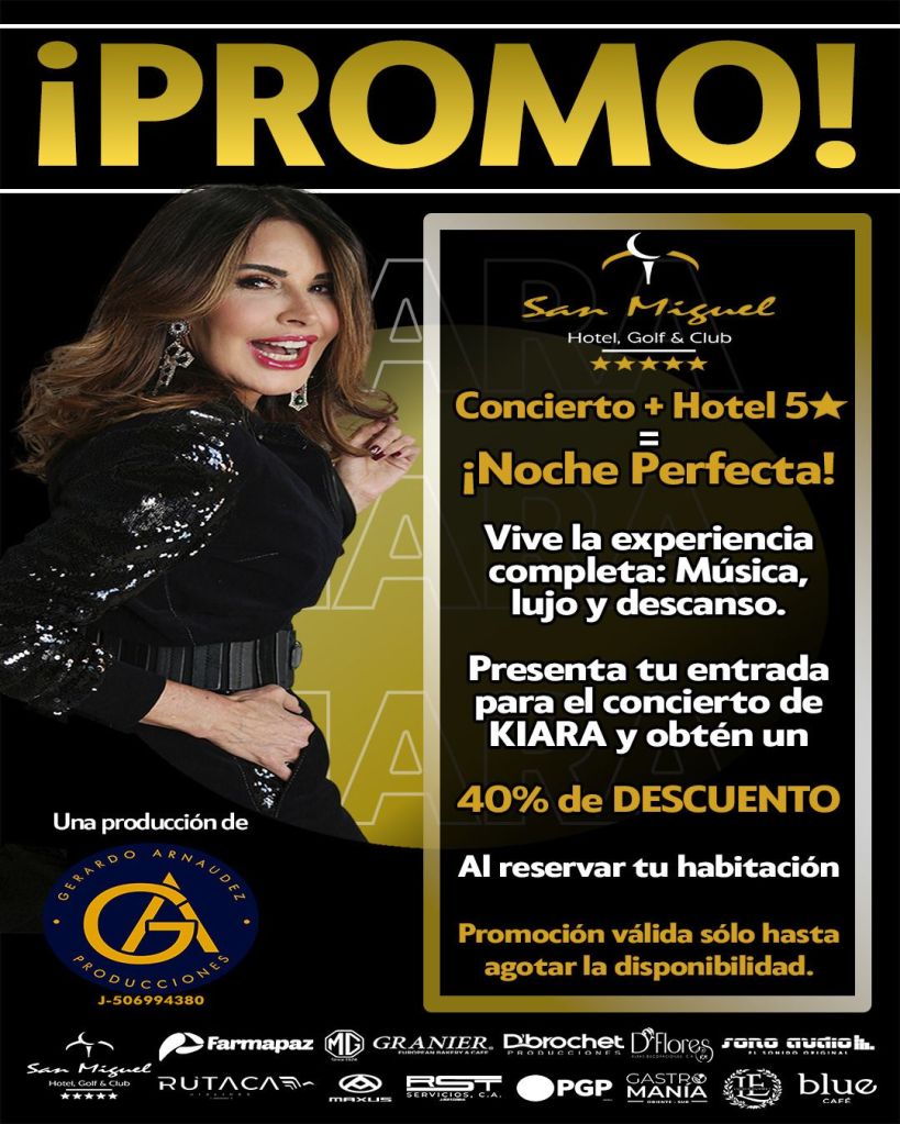 La energía y el inconfundible talento de la icónica artista venezolana Kiara llegan a la ciudad para una noche inolvidable. Este viernes 27 de junio, el Gran Salón del Hotel San Miguel Golf & Club, el cual se vestirá de gala para recibirla en un concierto que promete un recorrido por todo su repertorio de éxitos musicales.