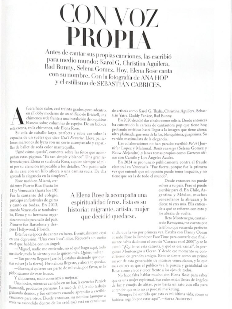 Con una sencillez que refleja su autenticidad, Rose compartió su emoción en sus redes sociales con la frase: «Yo soy Elena. (Inserta sonido de sueño hecho realidad)». El mensaje, cargado de sentimiento, iba acompañado de una poderosa declaración de orgullo por sus raíces: «Venezuela en Vogue», subrayando la importancia para ella de representar a su país en plataformas de alcance internacional.