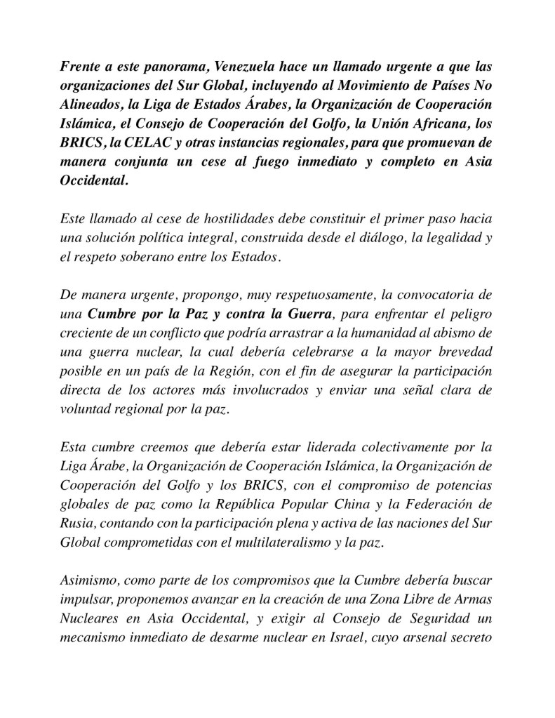 En el documento, Maduro advierte que «la situación en Asia Occidental ha entrado en una fase de máxima tensión y violencia». Por ello, dijo, que la «intensificación de las agresiones del Estado de Israel hacia la República Islámica de Irán, agravada por la acción militar de EE.UU. de Norteamérica al bombardear territorio iraní, amenaza con desencadenar una crisis con consecuencias catastróficas de naturaleza nuclear contra la región y el mundo».