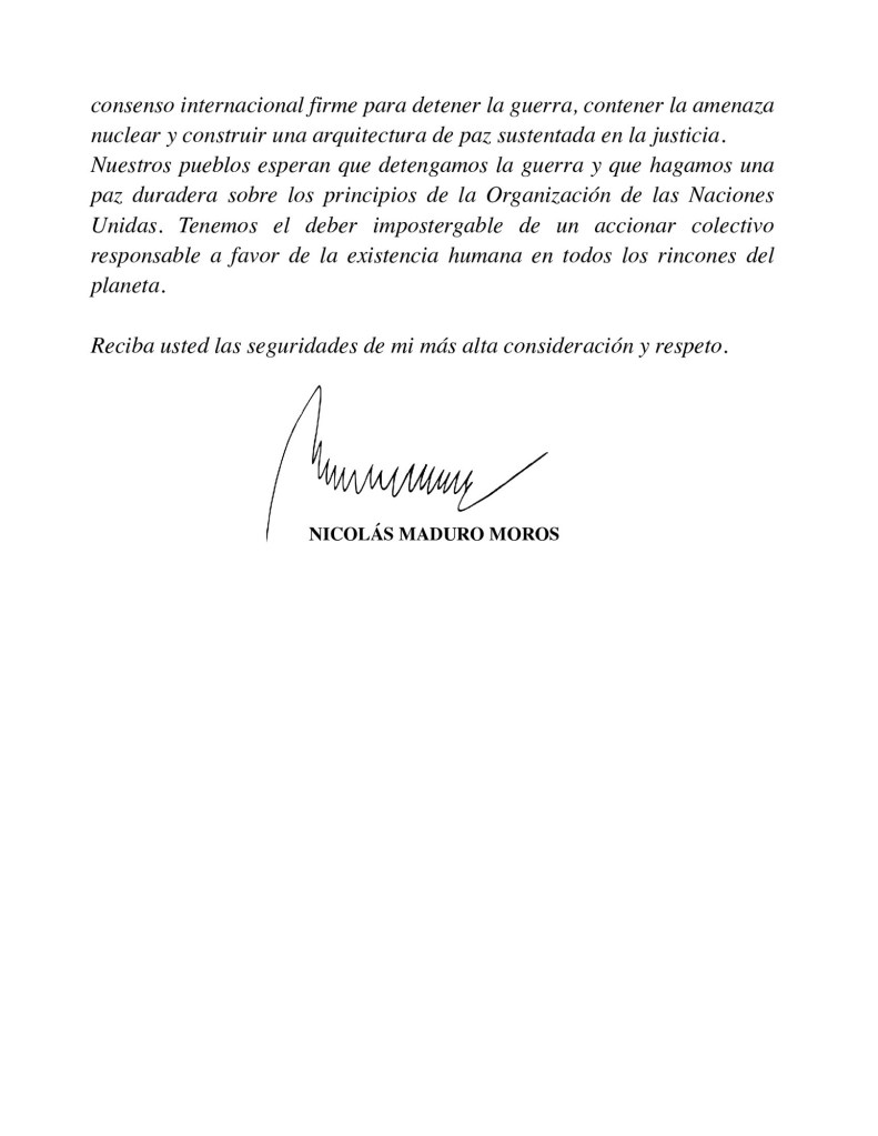 «Este llamado al cese de hostilidades debe constituir el primer paso hacia una solución política integral, construida desde el diálogo, la legalidad y el respeto soberano entre los Estados», agregó el presidente Maduro en su misiva.