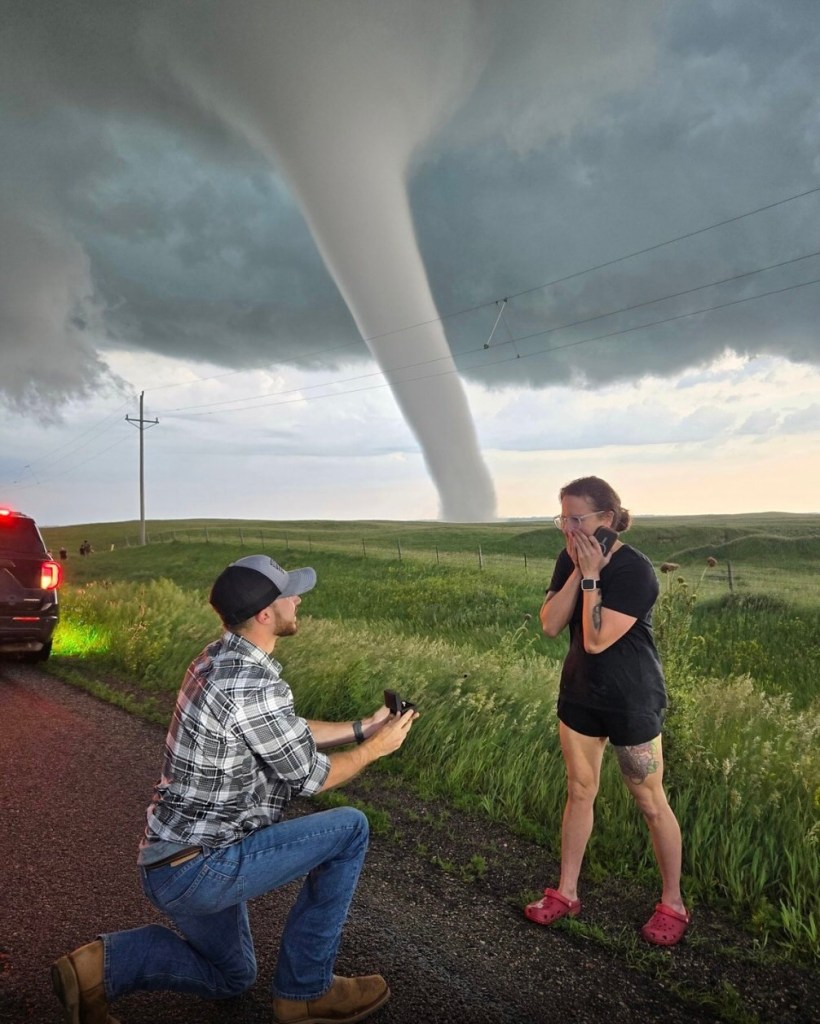 En una muestra de amor tan única como su pasión compartida, los cazadores de tormentas Bruce Shelton y Paige Berdomas se comprometieron en Dakota del Sur, teniendo como telón de fondo un imponente tornado. El dramático momento, que encapsula a la perfección su torbellino de romance, se ha vuelto viral, cautivando a miles en las redes sociales.