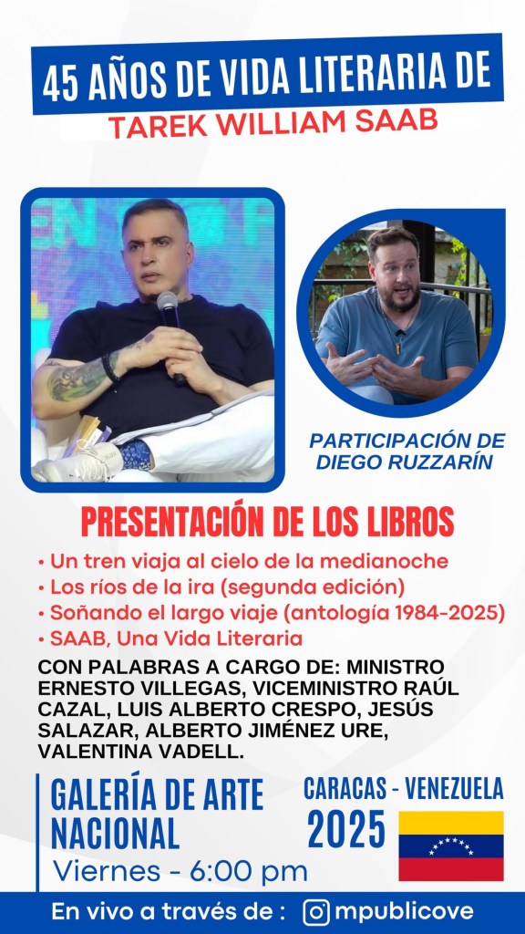 Este día viernes 4 de julio, se presentarán los libros: Los ríos de la ira (segunda edición), Un tren viaja al cielo de la medianoche (poemas 2021 al 2025), Soñando el largo viaje (en árabe y ruso) y Saab, una vida literaria (ensayo de J.Ure) contarán con palabras del Ministro Ernesto Villegas, Viceministro Raúl Cazal, Luis Alberto Crespo, Alberto Jiménez Ure, Jesús Salazar y Valentina Vadell: Además de la especial participación del reconocido escritor Diego Ruzzarin.