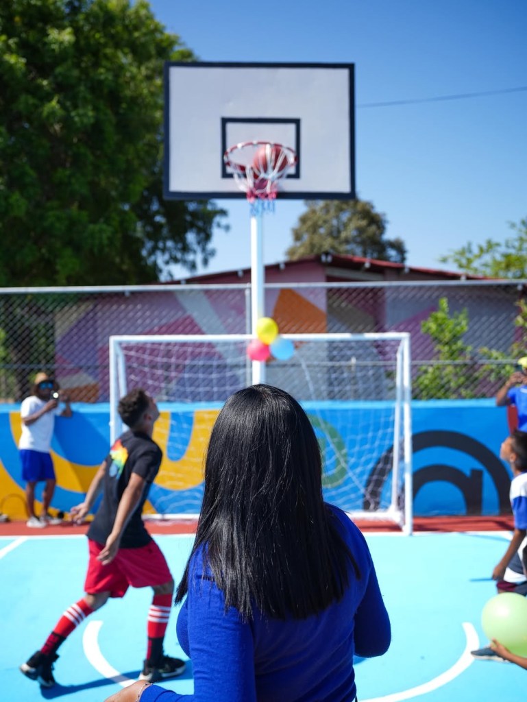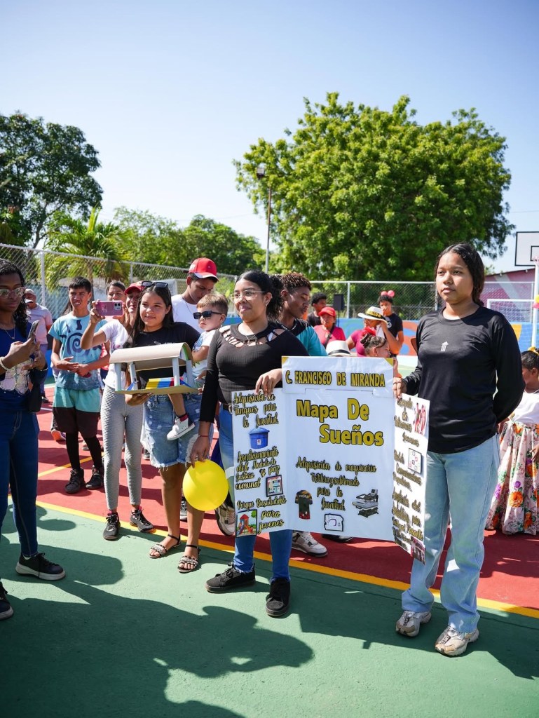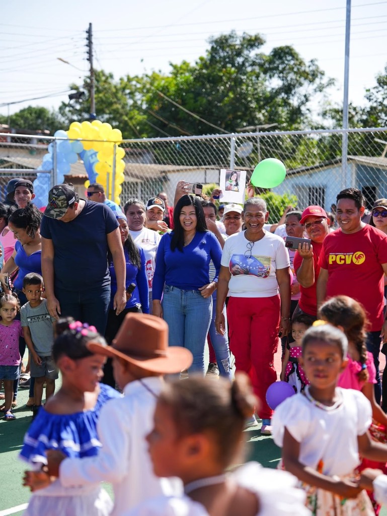 La alcaldesa de Barcelona, Sugey Herrera (@sugeyherreram) visitó la zona y constató los trabajos de recuperación que se hicieron a través del Instituto Autónomo Municipal de Deporte y Recreación (Iamder) de la @alcaldiabna en la cancha, donde la recibieron niños y niñas.