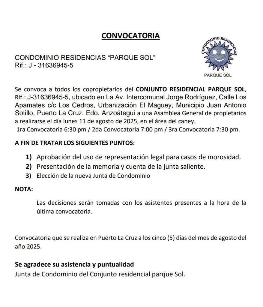 Se convoca a todos los copropietarios del CONJUNTO RESIDENCIAL PARQUE SOL,