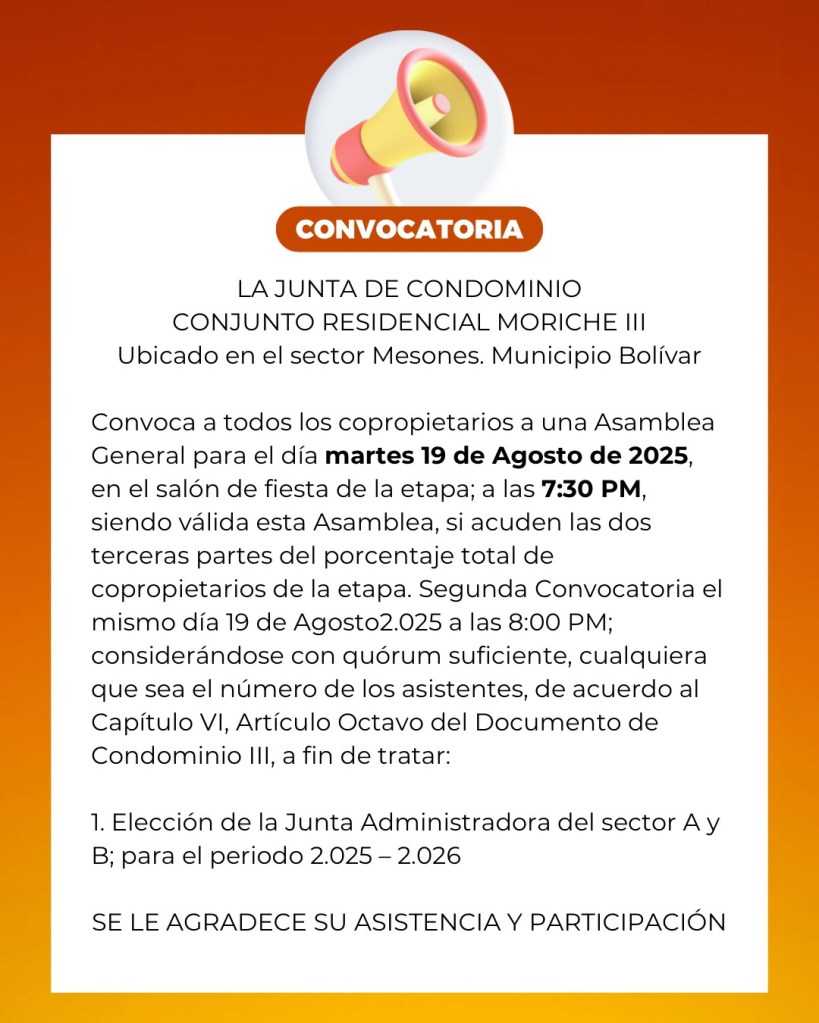 Convoca a todos los copropietarios a una Asamblea General para el día martes 19 de Agosto de 2.025, en el salón de fiesta de la etapa; a las 7:30 PM, siendo válida esta Asamblea, si acuden las dos terceras partes del porcentaje total de copropietarios de la etapa. Segunda Convocatoria el mismo día 19 de Agosto2.025 a las 8:00 PM; considerándose con quórum suficiente, cualquiera que sea el número de los asistentes, de acuerdo al Capítulo VI, Artículo Octavo del Documento de Condominio III, a fin de tratar: