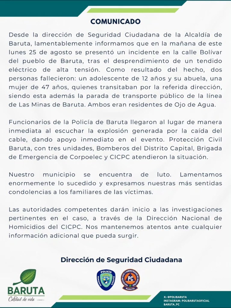La Dirección de Seguridad Ciudadana de la Alcaldía de Baruta confirmó el incidente a través de un comunicado en sus redes sociales, identificando a los fallecidos como abuela y nieto, ambos residentes del barrio Ojo de Agua. «Nuestro municipio se encuentra de luto. Lamentamos enormemente lo sucedido y expresamos nuestras más sentidas condolencias a los familiares de las víctimas», expresaron las autoridades en su cuenta de Instagram.