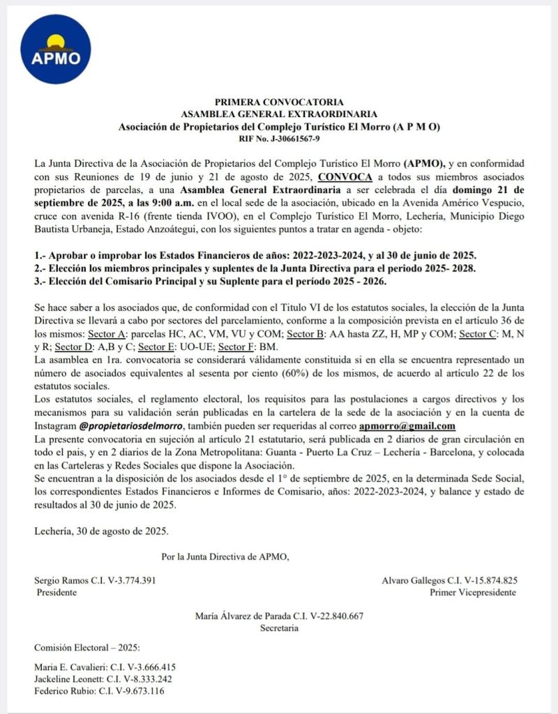 La Junta Directiva de la Asociación de Propietarios del Complejo Turístico El Morro (APMO), y en conformidad con sus Reuniones de 19 de junio y 21 de agosto de 2025, CONVOCA a todos sus miembros asociados propietarios de parcelas, a una Asamblea General Extraordinaria a ser celebrada el día domingo 21 de septiembre de 2025, a las 9:00 a.m. en el local sede de la asociación, ubicado en la Avenida Américo Vespucio, cruce con avenida R-16 (frente tienda IVOO), en el Complejo Turístico El Morro, Lechería, Municipio Diego Bautista Urbaneja, Estado Anzoátegui, con los siguientes puntos a tratar en agenda – objeto: