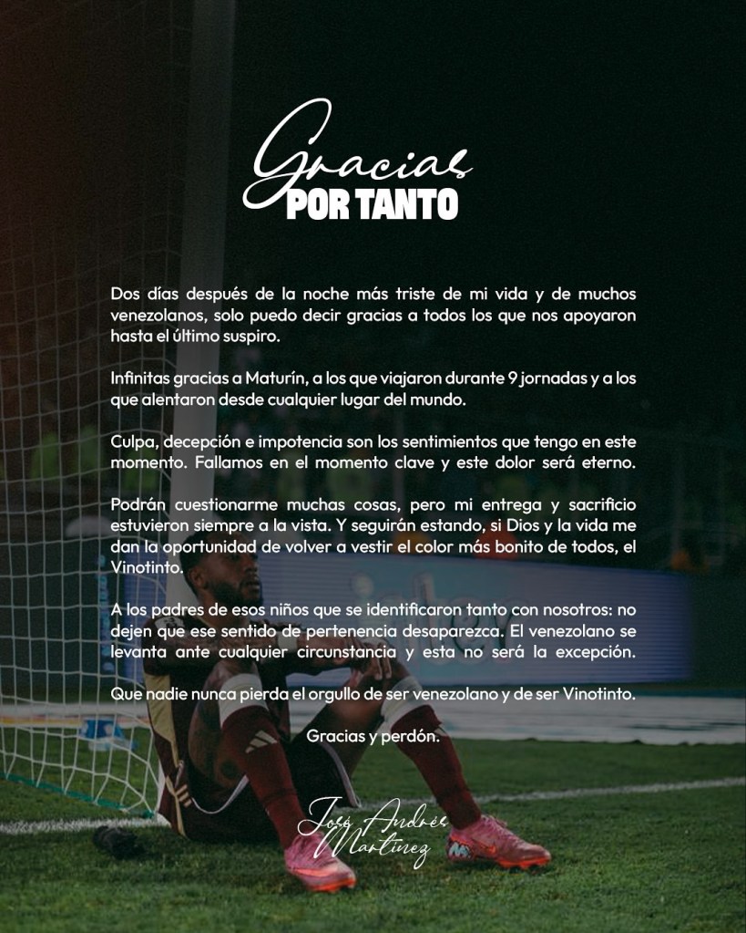 El jugador de fútbol venezolano e integrante de la selección nacional, José “El brujo” Martínez publicó un mensaje en sus redes sociales tras la eliminación de Venezuela.