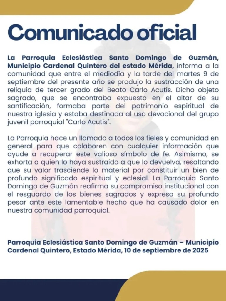 Una comisión del Cuerpo de Investigaciones Científicas, Penales y Criminalísticas (CICPC) ha iniciado una exhaustiva investigación en el estado Mérida para dar con el paradero de una reliquia del beato Carlo Acutis. El objeto de gran valor espiritual fue sustraído de la parroquia Santo Domingo de Guzmán, ubicada en el sector Santo Domingo, en pleno páramo merideño, perteneciente al municipio Cardenal Quintero. El hecho ha generado una profunda consternación entre los habitantes y la comunidad católica de la región.