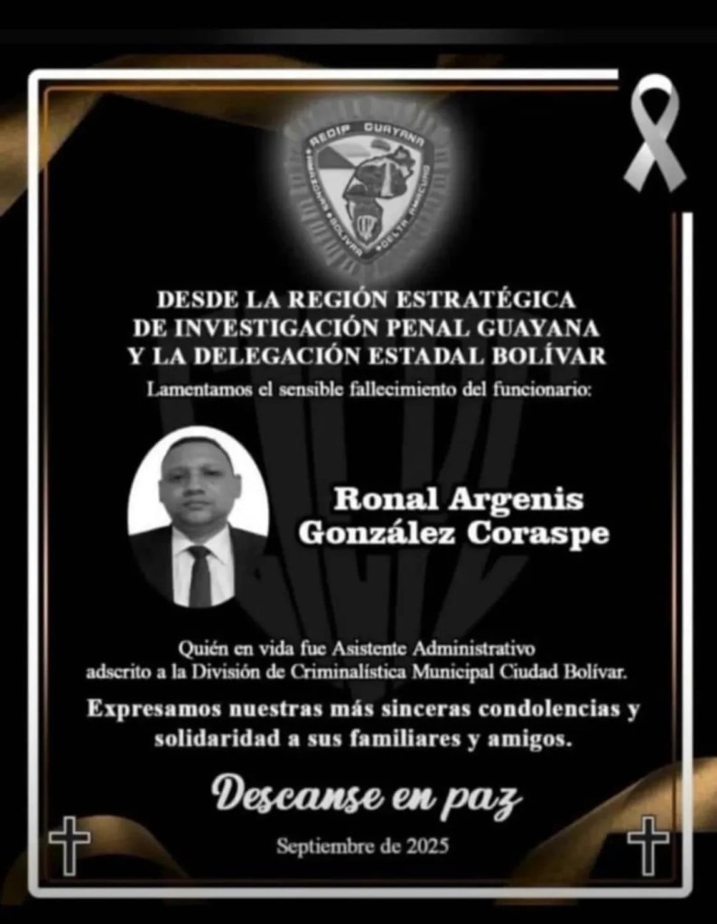 El funcionario fue identificado como Ronald Argenis González Coraspe, quien estaba adscrito a la división de criminalística de la delegación municipal de Ciudad Bolívar.