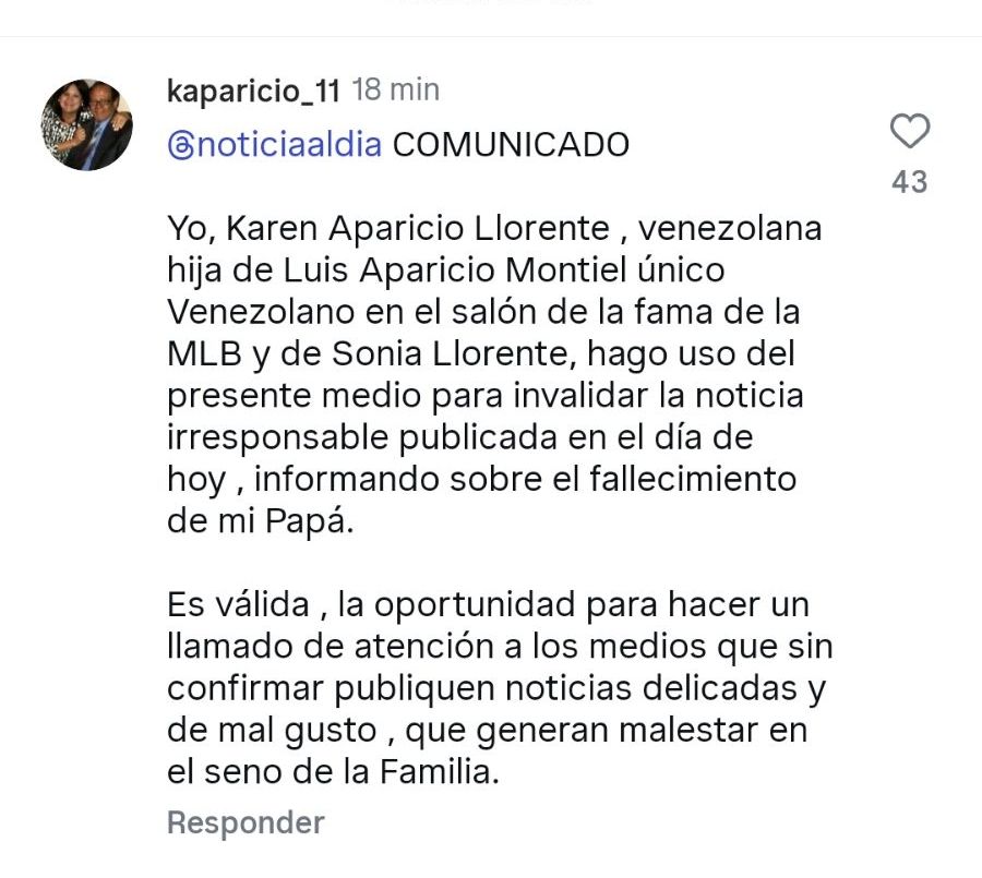 «Yo, Karen Aparicio Llorente , venezolana hija de Luis Aparicio Montiel único enezolano en el salón de la fama de la MLB y de Sonia Llorente, hago uso del presente medio para invalidar la noticia irresponsable publicada en el día de hoy ,informando sobre el fallecimiento de mi Papá.