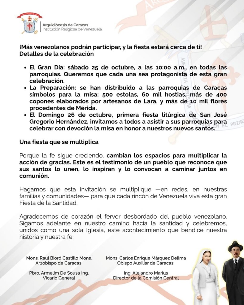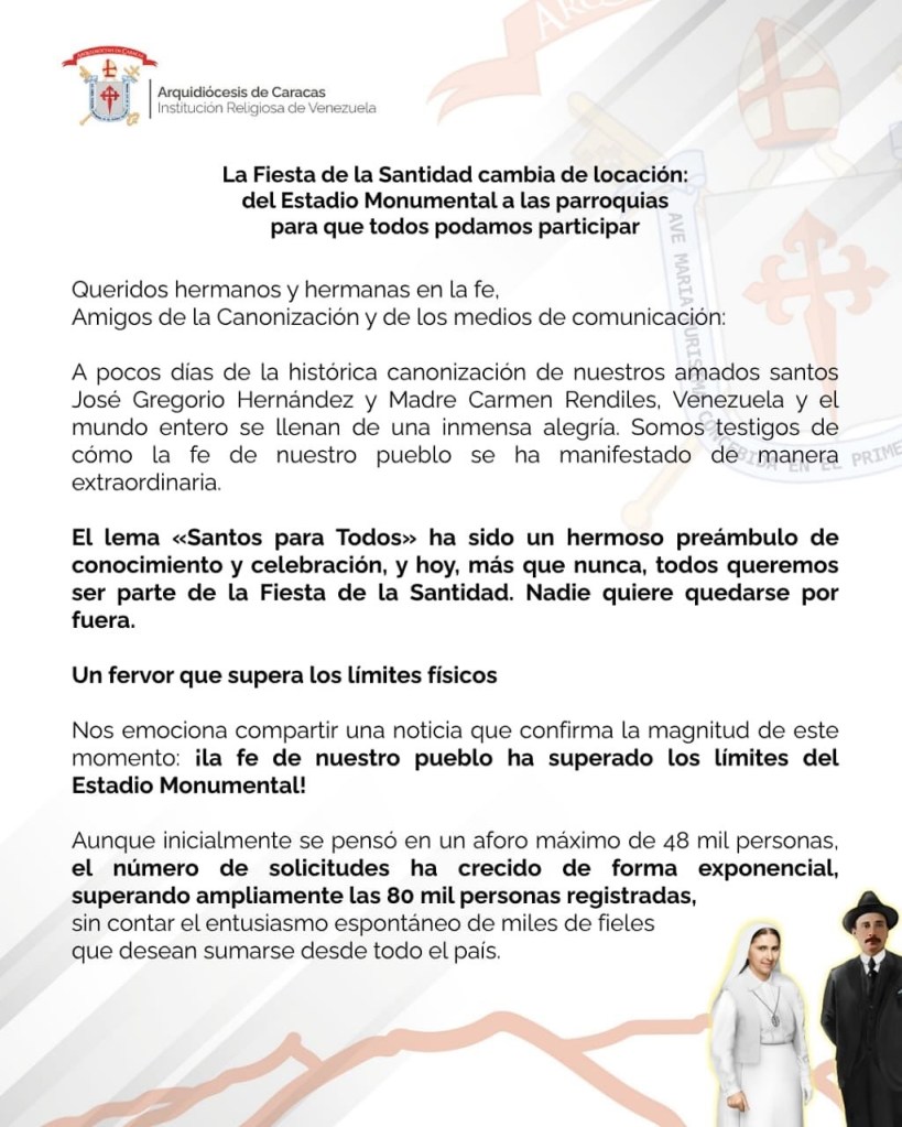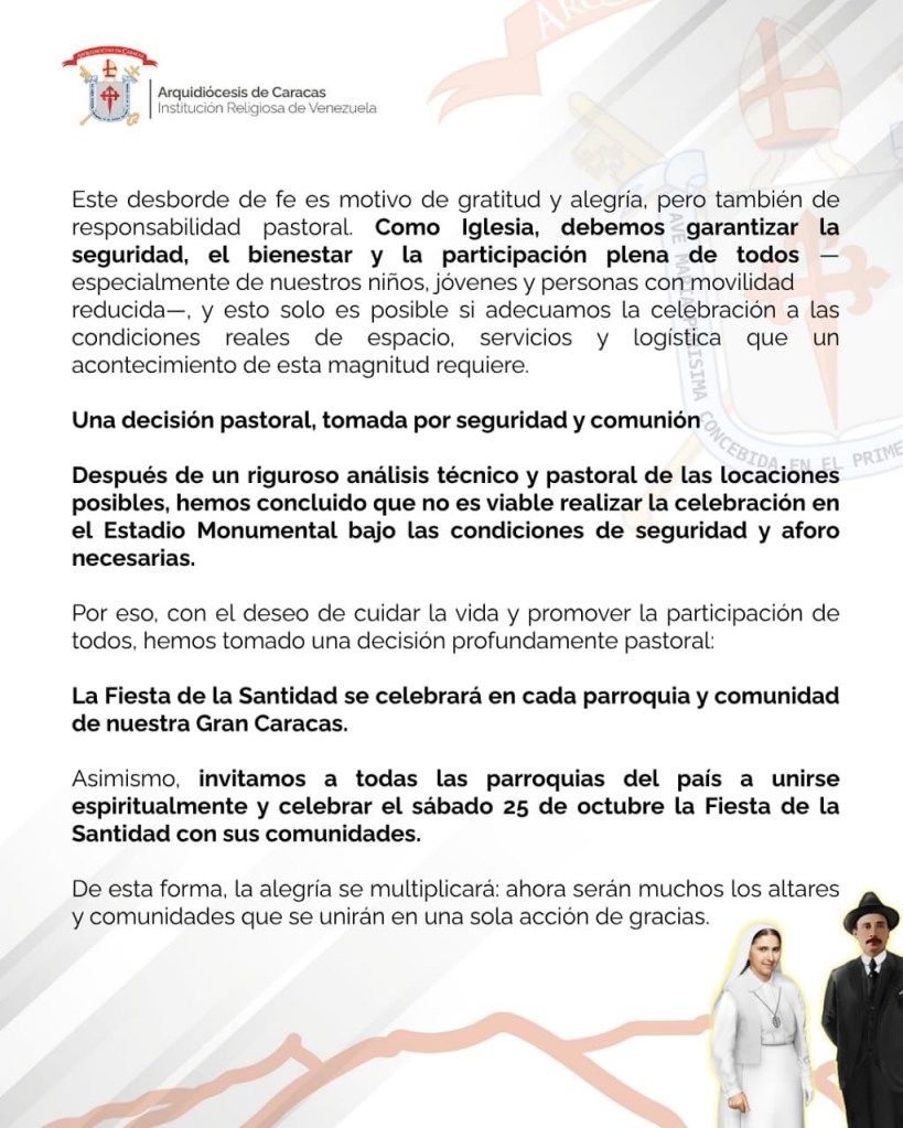 Ante esta situación, la Arquidiócesis de Caracas decidió que «La Fiesta de la Santidad» se celebrará de forma descentralizada. La conmemoración se llevará a cabo en cada parroquia y comunidad de Caracas el sábado 25 de octubre. De igual manera, se extendió una invitación a todas las parroquias del resto del país para que se unan espiritualmente y organicen celebraciones en sus propios sectores, permitiendo así una participación segura y masiva a nivel nacional.