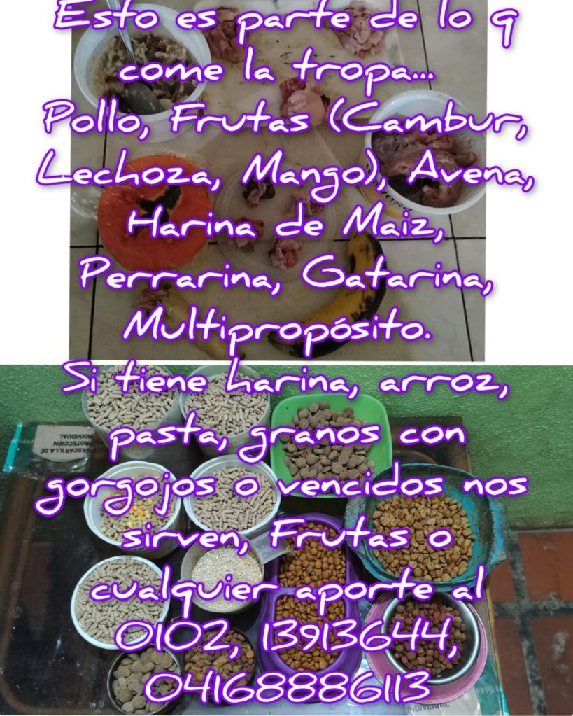 Si quieres colaborar con Eliana le puedes hacer llegar pollo (pellejos, carapachos, etc), cambur, lechosa, mango, avena, harina de maíz, perrarina, gatarina, o si prefieres hazle un aporte a su pago móvil, Banco de Venezuela (0102) CI 13913644, teléfono 0416-8886113.