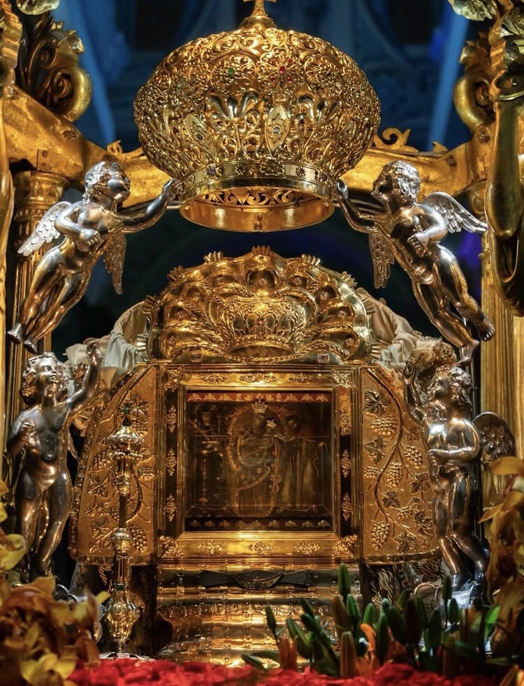 La sagrada imagen salió de la Basílica a las 7:00 de la mañana en hombros de los Servidores de María, precedida por una majestuosa procesión que incluía la gran corona de oro, ofrenda del pueblo, transportada en una carroza escoltada por niñas vestidas de ángeles. El momento cumbre de la ceremonia llegó cuando Monseñor Godoy, arrodillado ante la Reliquia y tras entonar el Regina Coeli, colocó la presea primero al Niño Jesús y luego a la Virgen, exclamando la fórmula ceremonial de gloria y honor. El acto fue sellado por el estruendo de cañones, el vuelo rasante de nueve aviones militares y la liberación de cientos de palomas con los colores de la bandera de Venezuela, desatando una ovación ensordecedora de la feligresía.