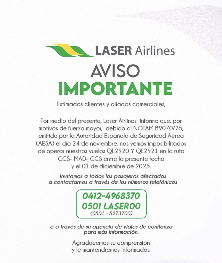 Laser Airlines anunció este martes la suspensión de sus operaciones en la ruta Caracas-Madrid-Caracas, afectando específicamente los vuelos QL2920 y QL2921. La aerolínea informó que esta medida obedece a causas de fuerza mayor derivadas del NOTAM B9070/25, emitido por la Autoridad Española de Seguridad Aérea (AESA) el pasado 24 de noviembre, lo que imposibilita la realización de estos vuelos desde la fecha actual hasta el 1 de diciembre de 2025.