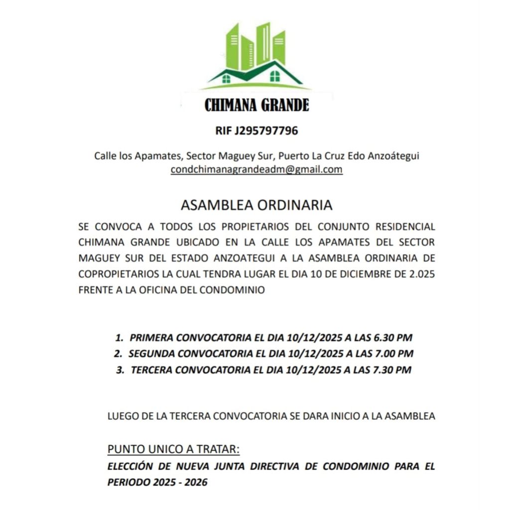 SE CONVOCA A TODOS LOS PROPIETARIOS DEL CONJUNTO RESIDENCIAL CHIMANA GRANDE UBICADO EN LA CALLE LOS APAMATES DEL SECTOR MAGUEY SUR DEL ESTADO ANZOATEGUI A LA ASAMBLEA ORDINARIA DE COPROPIETARIOS LA CUAL TENDRA LUGAR EL DIA 10 DE DICIEMBRE DE 2.025 FRENTE A LA OFICINA DEL CONDOMINIO