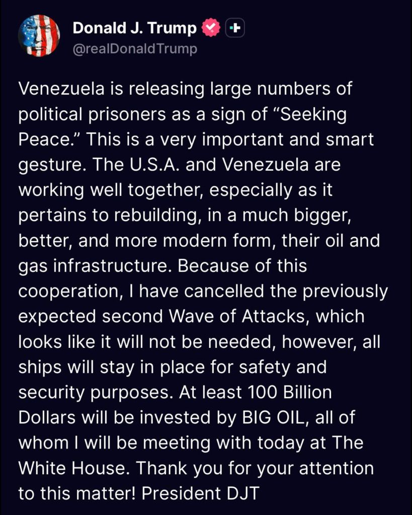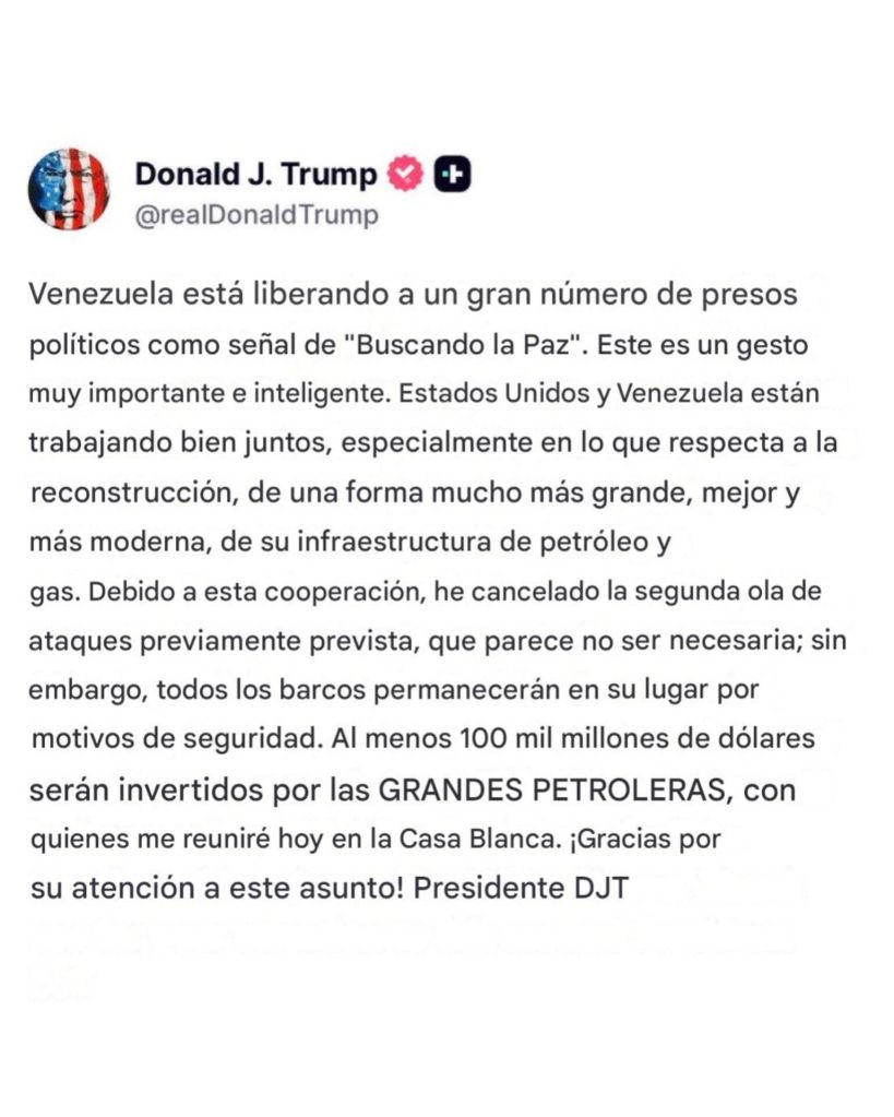 Este viernes 09 de enero amaneció noticioso, por un lado, el Presidente de Estados Unidos, Donald Trump, revela que había programado un segundo ataque para Venezuela, pero el mismo fue cancelado por las liberaciones de un «gran número de presos políticos, como señal que están buscando la paz».