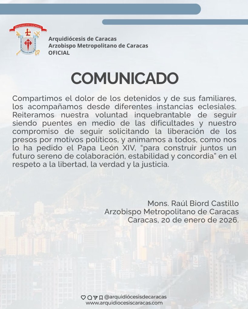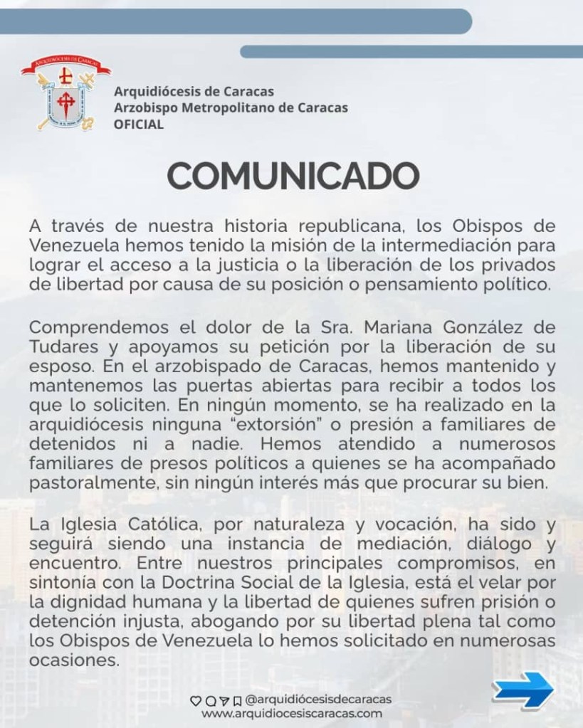 Menos de 24 horas antes, la Arquidiócesis de Caracas había emitido un comunicado desligándose de unos señalamientos de «extorsión» que la esposa de Tudares había hecho. «Comprendemos el dolor de la Sra. Mariana González de Tudares L apoyamos Su petición por LƏ liberacion de SU esposo. En el arzobispado de Caracas. hemos mantenido y mantenemos las puertas abiertas para recibir a todos los que lo soliciten. En ningún momento, se ha realizado en la arquidiócesis ninguna «extorsión» o presión a familiares de detenidos ni a nadie. Hemos atendido a numerosos familiares de presos políticos a quienes se ha acompañado pastoralmente, sin ningún interés más que procurar su bien».