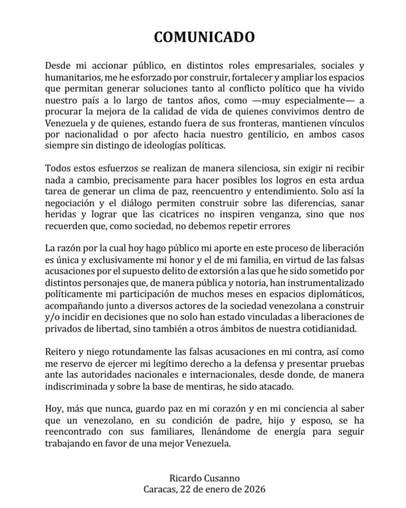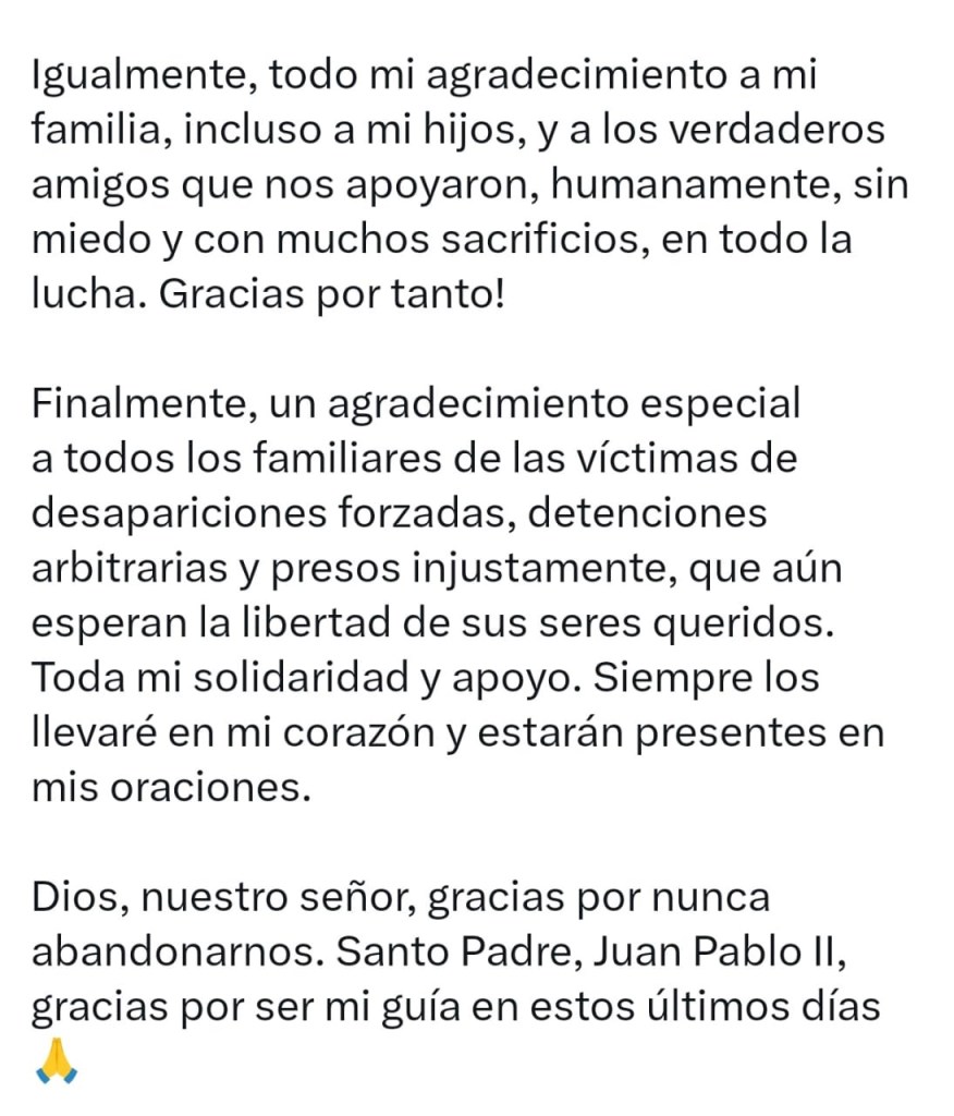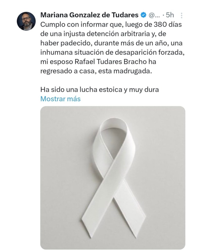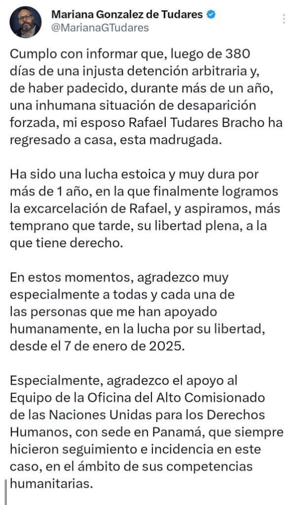 A las 2:30 de la madrugada Mariana González usó su cuenta X para confirmar que su esposo ya estaba en casa. También agradeció a las personas que de manera sincera y desprendida apoyaron este proceso que duró poco más de un año. Especialmente agradeció «el apoyo al Equipo de la Oficina del Alto Comisionado de las Naciones Unidas para los Derechos Humanos, con sede en Panamá, que siempre hicieron seguimiento e incidencia en este caso,en el ámbito de sus competencias humanitarias».