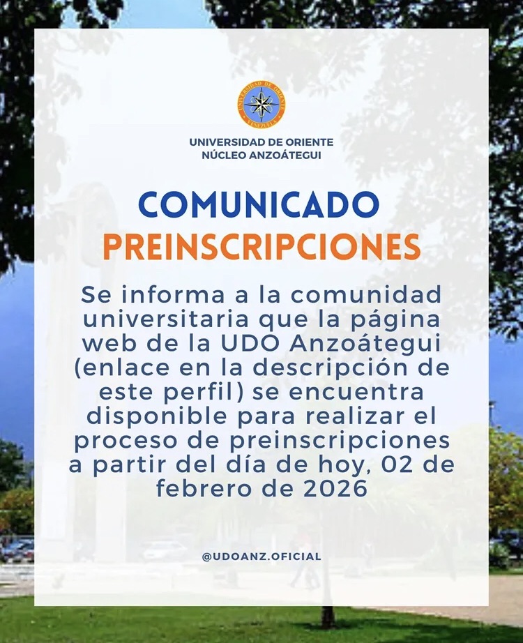 La Universidad de Oriente (UDO), Núcleo Anzoátegui, anunció este miércoles 3 de febrero la apertura oficial del proceso de preinscripciones para nuevos ingresos. Según el comunicado difundido a través de sus canales digitales, la plataforma tecnológica de la institución fue habilitada desde el pasado martes 2 de febrero, permitiendo a los aspirantes iniciar formalmente su trámite de ingreso para el próximo ciclo académico.