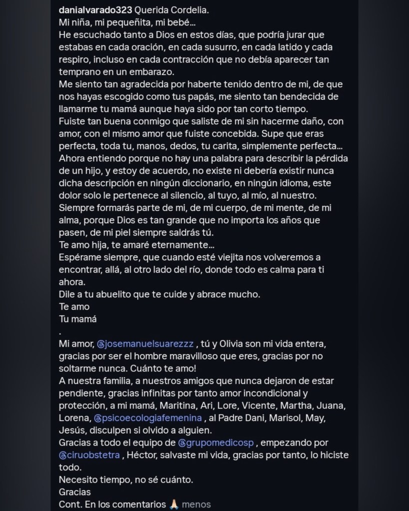 La reconocida actriz venezolana Daniela Alvarado conmovió a sus seguidores este lunes al compartir un desgarrador mensaje de despedida para su hija, Cordelia. La noticia se dio a conocer luego de que su esposo, el actor José Manuel Suárez, informara sobre el nacimiento prematuro de la bebé, quien lamentablemente no logró sobrevivir fuera del útero. La publicación, cargada de sentimiento, refleja el profundo dolor de la pareja ante la pérdida de su pequeña, cuya llegada había generado gran expectativa entre sus allegados y el público.