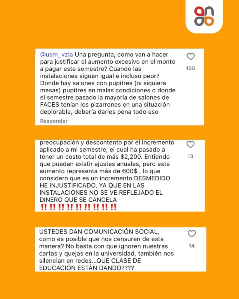 La comunidad estudiantil de la Universidad Santa María (USM), Núcleo Oriente, manifestó su rotundo rechazo al incremento en el costo del semestre previsto para iniciar el próximo mes de marzo. A través de redes sociales, los bachilleres denunciaron que, al ingresar al sistema Terna-USM para el proceso de inscripción, se encontraron con montos que oscilan entre los 1.600 y 2.000 dólares, dependiendo de la carrera.