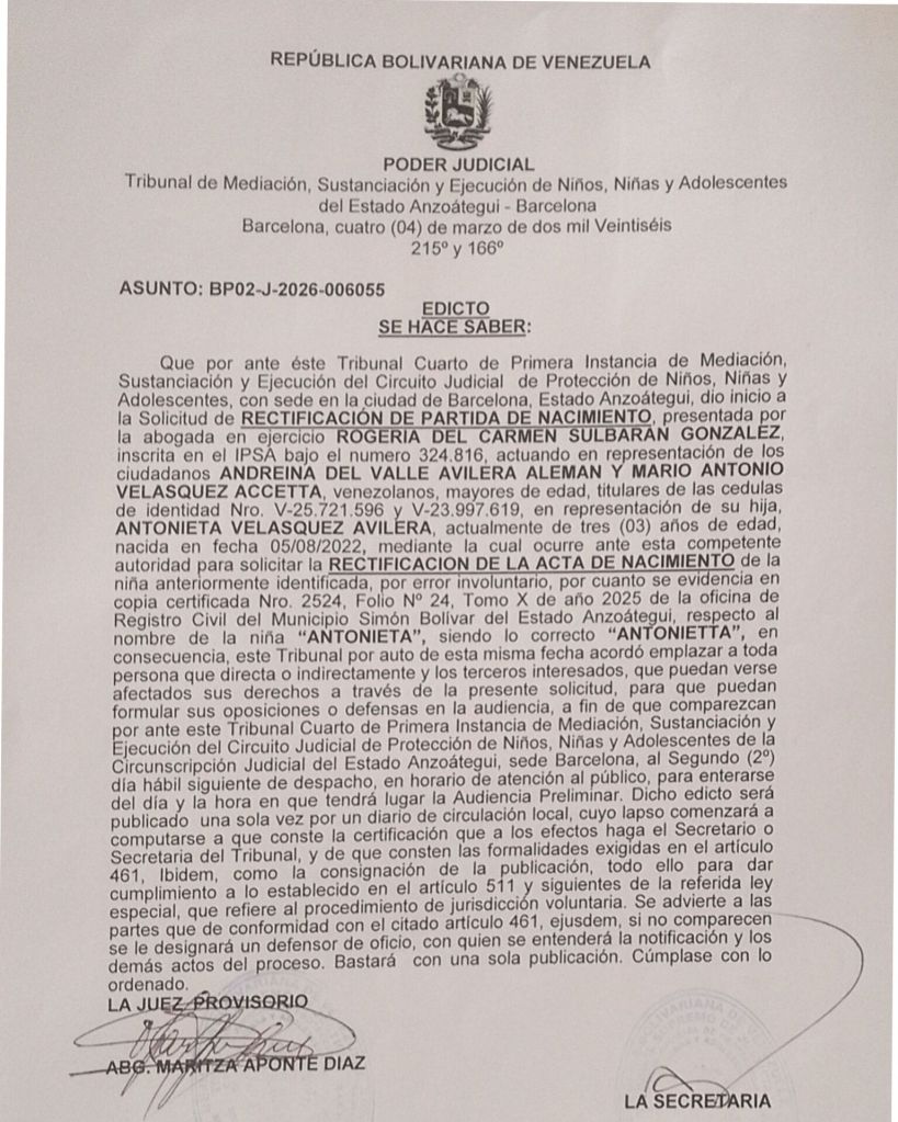 Que por ante éste Tribunal Cuarto, de, Primera, Instancia de Mediación, Sustanciacion y Ejecucion del Circuito Judicial de Protección de Niños, Niñas y Adolescentes, con sede en la ciudad de Barcelona, Estado Anzoátegui, dio inicio a la Solicitud de RECTIFICACION DE PARTIDA DE NACIMIENTO, presentada por la abogada en ejercicio ROGERIA DEL CARMEN SULBARÁN GONZÁLEZ, inscrita en el IPSA bajo el número 324,816, actuando en representación de los ciudadanos ANDREINA DEL VALLE AVILERA ALEMÁN Y MARIO ANTONIO VELÁSQUEZ ACCETTA, venezolanos, mayores de edad, titulares de las cédulas le identidad Nro. V-25.721.596 y v-23.997.619, en representación de su hija, ANTONIETA VELÁSQUEZ AVILERA, actualmente de tres (03) años de edad, nacida en fecha 05/08/2022, mediante la cual ocurre ante esta competente autoridad para solicitar la RECTIFICACION DE LA ACTA DE NACIMIENTO de la niña anteriormente identificada, por error involuntario, por cuanto se evidencia en copia certificada Nro. 2524, Folio No 24,Tomo X de año 2025 de la oficina de Registro Civil del Municipio Simón Bolivar de| Estado Anzoátegui, respecto al nombre de la niña «ANTONIETA», siendo lo correcto «ANTONIETTA«, en consecuencia, este Tribunal por auto de esta misma fecha acordó emplazar a toda persona que directa o indirectamente y los terceros interesados, que puedan verse afectados sus derechos a través de la presente solicitud, para que puedan formular sus oposiciones o defensas en la audiencia, a fin de que comparezcan por ante este Tribunal Cuarto de Primera Instancia de Mediación, Sustanciación y Ejecución del Circuito Judicial de Protección de Niños, Niñas y Adolescentes de la Circunscripción Judicial del Estado Anzoátegui, sede Barcelona, al Segundo (2°) dia hábil siguiente de despacho, en horario de atención al público, para enterarse del dia y la hora en que tendrá lugar la Audiencia Preliminar. Dicho edicto será publicado una sola vez por un diario de circulación local, cuyo lapso comenzará a computarse a que conste la certificación que a los efectos haga el Secretario o Secretaria del Tribunal, y de que consten las formalidades exigidas en el artículo 461, Ibidem, como la consignación de la publicación, todo ello para dar cumplimiento a lo establecido en el articulo 511 y siguientes de la referida ley especial, que refiere al procedimiento de jurisdicción voluntaria. Se advierte a las partes que de conformidad con el citado artículo 461, ejusdem, si no comparecen se le designará un defensor de oficio, con quien se entenderá la notificación y los demás actos del proceso. Bastará con una sola publicación. Cumplase con lo ordenado.
