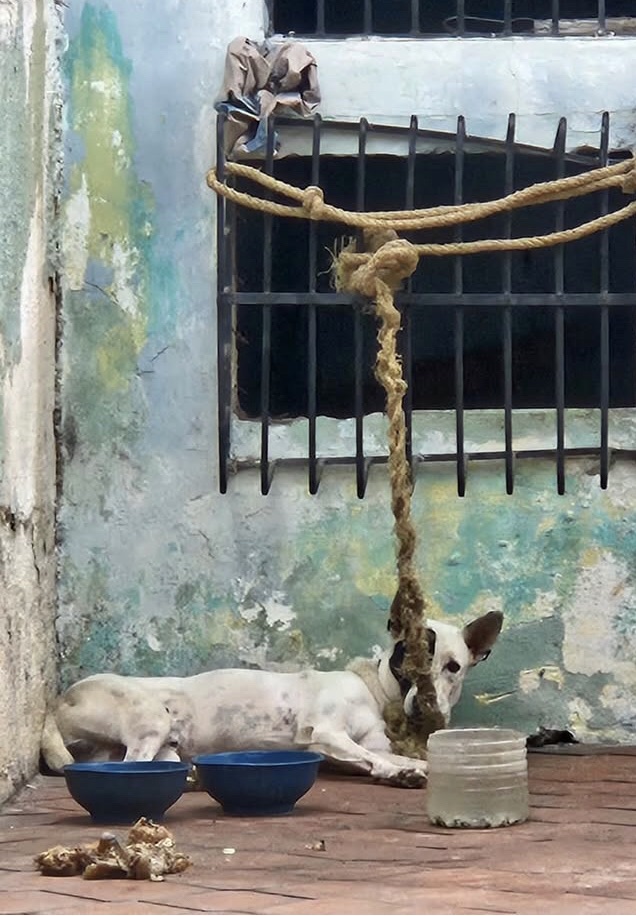 Según el reporte de la organización, un canino se encuentra en condiciones críticas de salud, permaneciendo amarrado con una cabuya a la ventana de una vivienda situada justo frente al edificio Guanire Plaza.