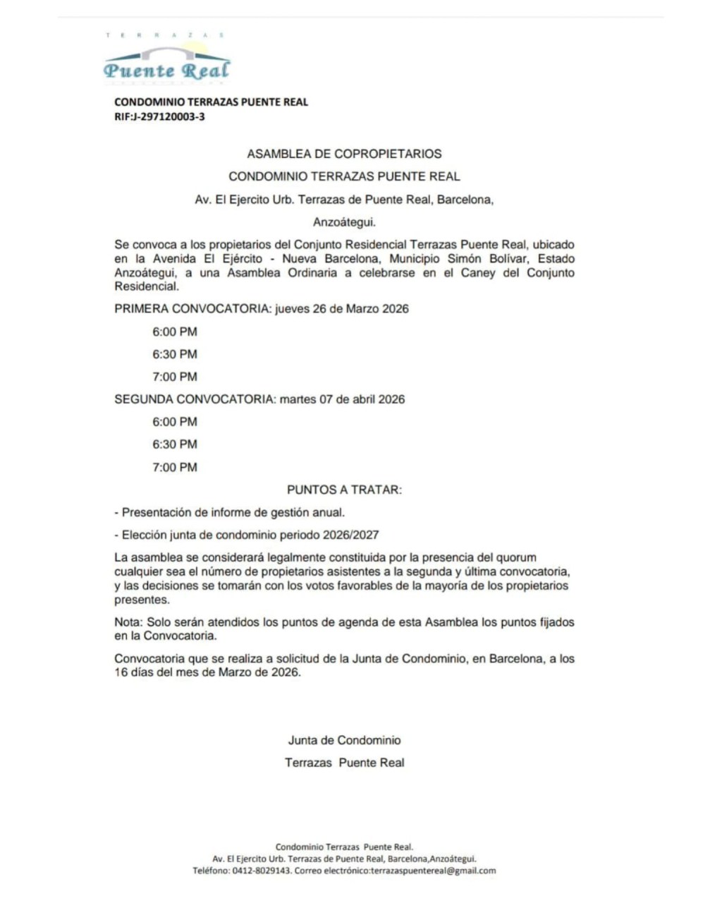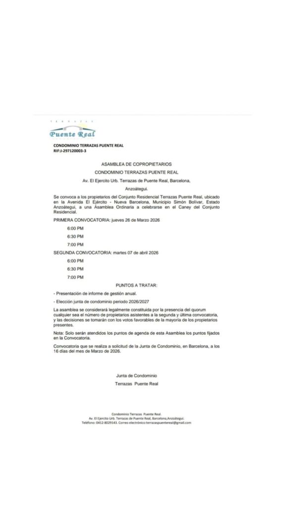 Se convoca a los propietarios del Conjunto Residencial Terrazas Puente Real, ubicado en la Avenida E Ejército – Nueva Barcelona, Municipio Simon Bolivar, Estado Anzoátegui, a una Ásamblea Ordinaria a celebrarse en el Caney del Conjunto Residencial.