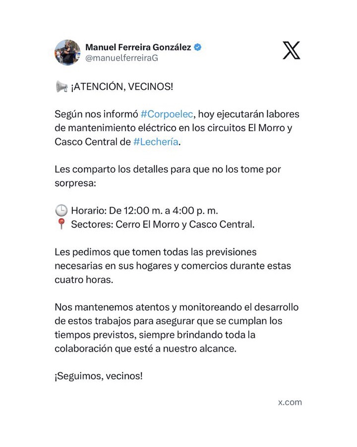 El alcalde del municipio Diego Bautista Urbaneja, Manuel Ferreira, informó que este miércoles 18 de marzo se llevarán a cabo labores de mantenimiento preventivo en la red eléctrica de Lechería.