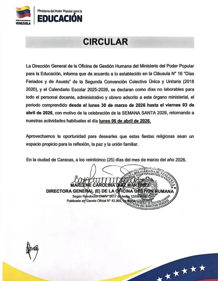El Ministerio del Poder Popular para la Educación (MPPE) oficializó el asueto correspondiente a la Semana Santa 2026, estableciendo un cese de actividades escolares y administrativas desde el lunes 30 de marzo hasta el viernes 3 de abril. La medida, anunciada mediante una circular oficial, busca garantizar el cumplimiento del calendario institucional y permitir el descanso de los trabajadores del sector durante la conmemoración de la festividad religiosa.