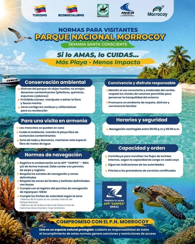 El Ministerio de Turismo (Mintur) publicó oficialmente las normas de convivencia y conservación ambiental que regirán en el Parque Nacional Morrocoy durante esta Semana Santa. A través de sus canales oficiales, el ente recordó que, al ser un espacio protegido, el resguardo del ecosistema recae en la responsabilidad compartida de todos los ciudadanos. En este sentido, las autoridades advirtieron que el incumplimiento de las directrices generará sanciones administrativas y restricciones inmediatas de acceso al parque para garantizar el orden durante el asueto.