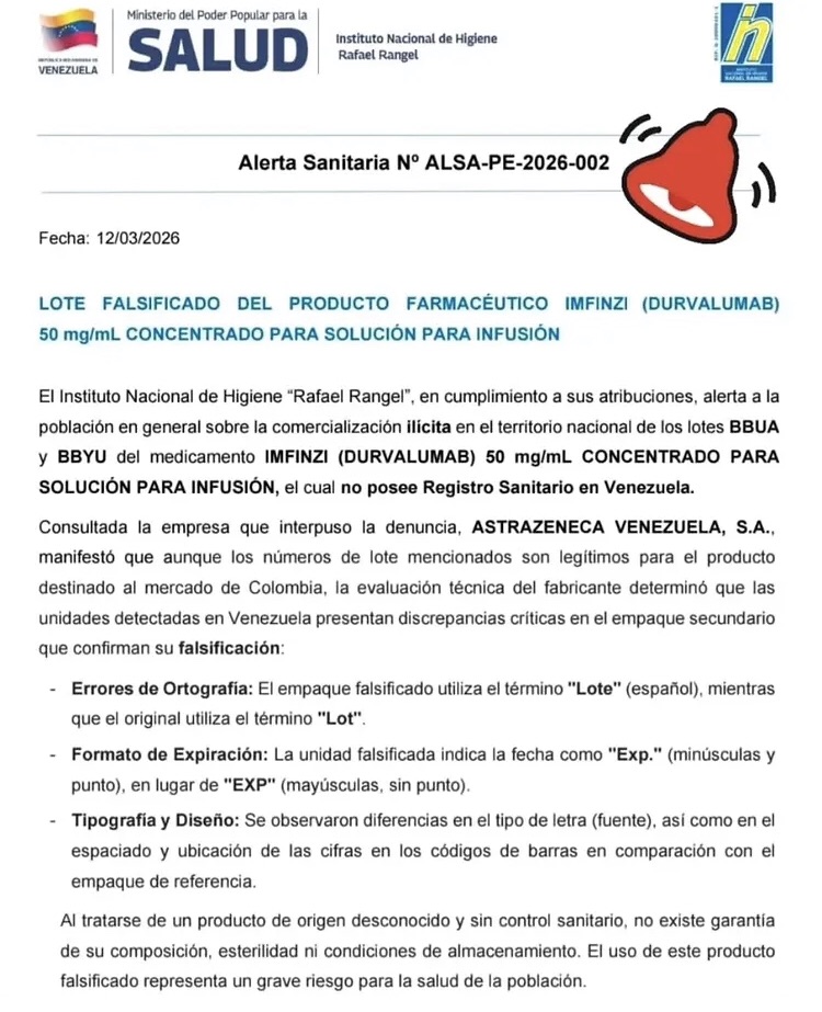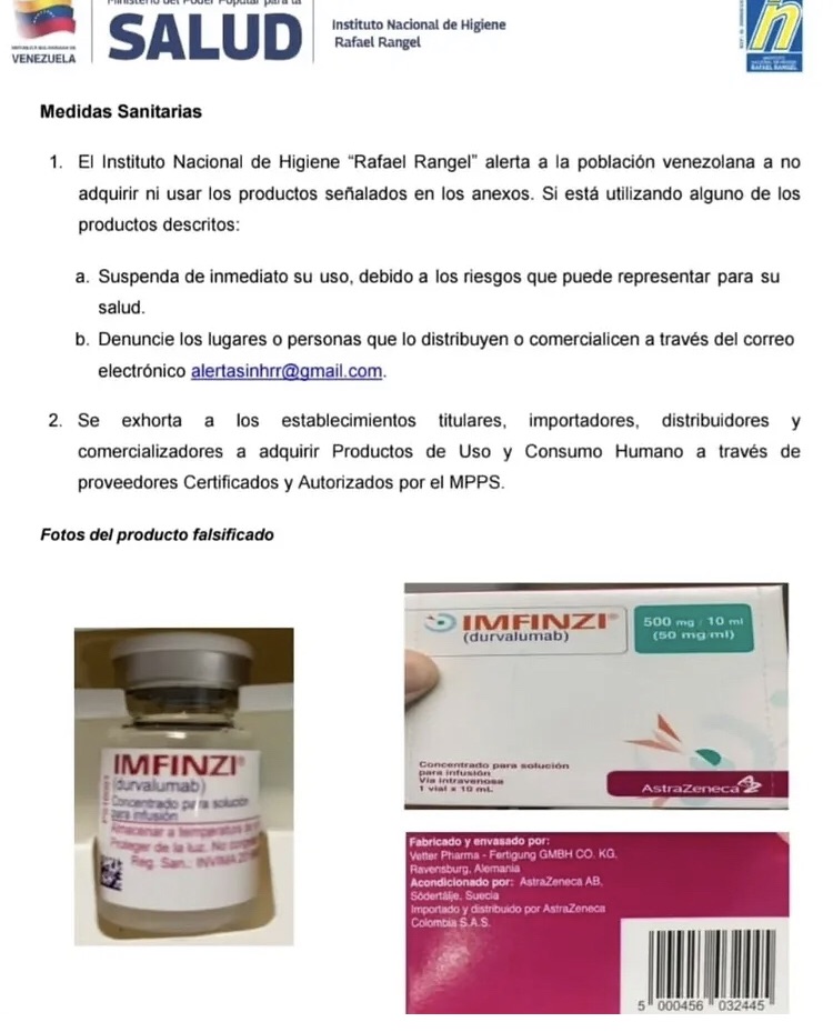 El Ministerio de Salud de Venezuela emitió este miércoles 8 de abril una alerta sanitaria tras detectar la comercialización de lotes falsificados del producto farmacéutico Imfinzi (Durvalumab) de 50mg/mL, un concentrado para solución e infusión. La medida fue difundida a través de los canales oficiales del ministerio, basándose en una investigación del Instituto Nacional de Higiene «Rafael Rangel» (INHRR), que confirmó la circulación ilícita de este medicamento en el territorio nacional.