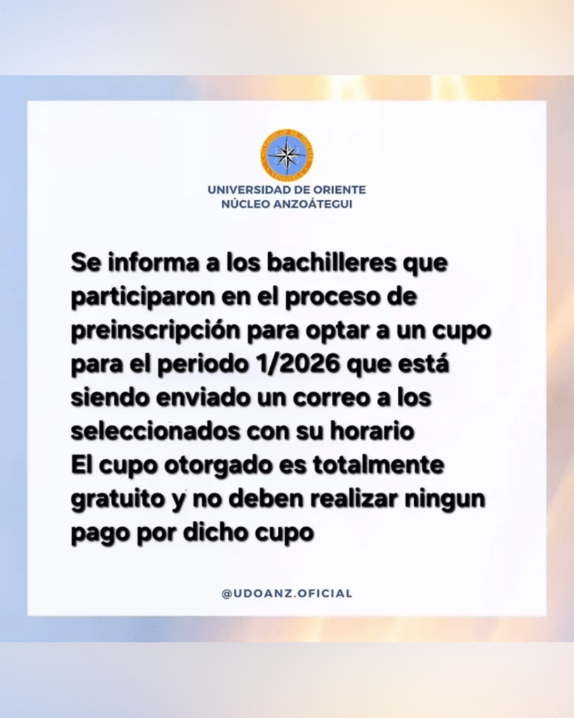 A través de su cuenta oficial en Instagram, @udoanz.oficial, la institución informó que los bachilleres que participaron en el proceso de preinscripción ya están recibiendo en sus bandejas de entrada el correo electrónico que confirma su selección, el cual incluye además el horario de clases asignado para el inicio de sus actividades.